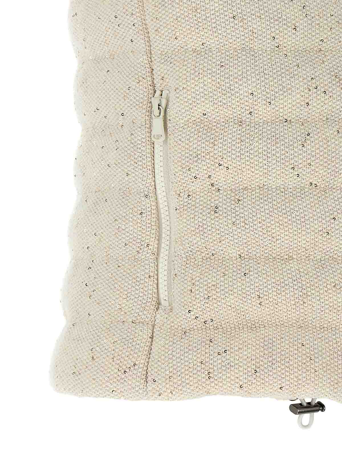 Blendende Weste aus gewebter Baumwolle mit durchgehender Paillettenapplikation, Futter aus technischem Gewebe mit Gänsefederpolsterung, Stehkragen, Frontreißverschluss, Taschen, Kordelzug am Saum.