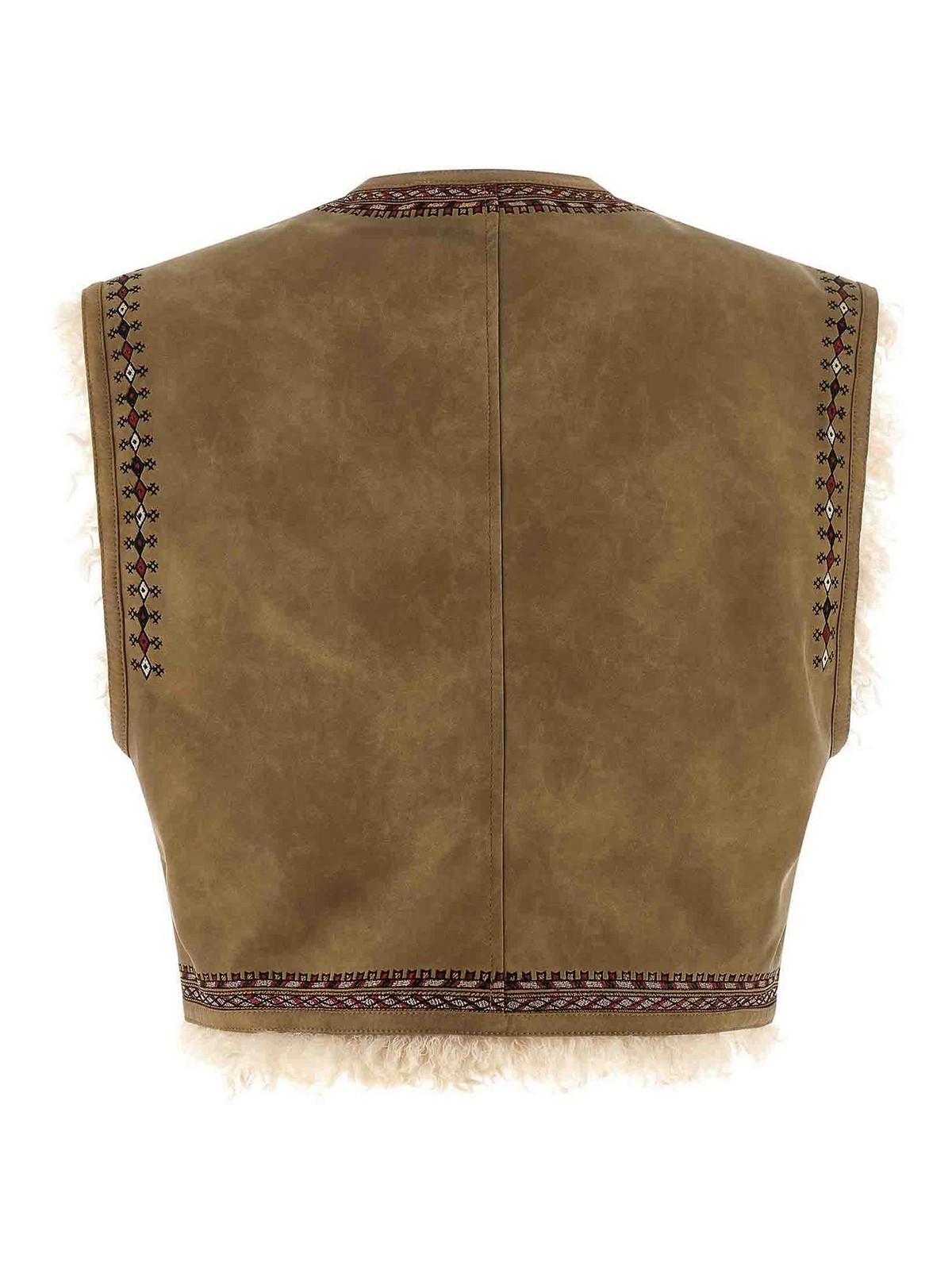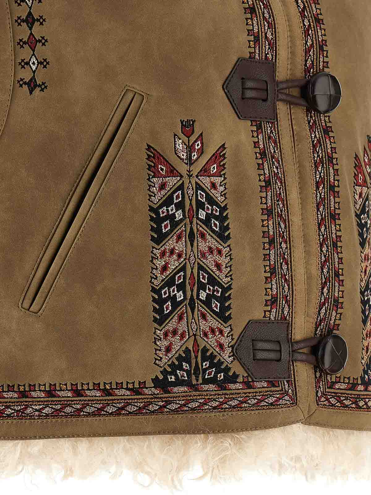 Weste von Clemencia aus doppelseitigem Stoff in Velourslederoptik mit Stickereien auf Vorder- und Rückseite, Futter aus Stoff in Lammfelloptik, leicht geschnittenes Modell, Rundhalsausschnitt, Knebelverschluss an der Vorderseite, Taschen.