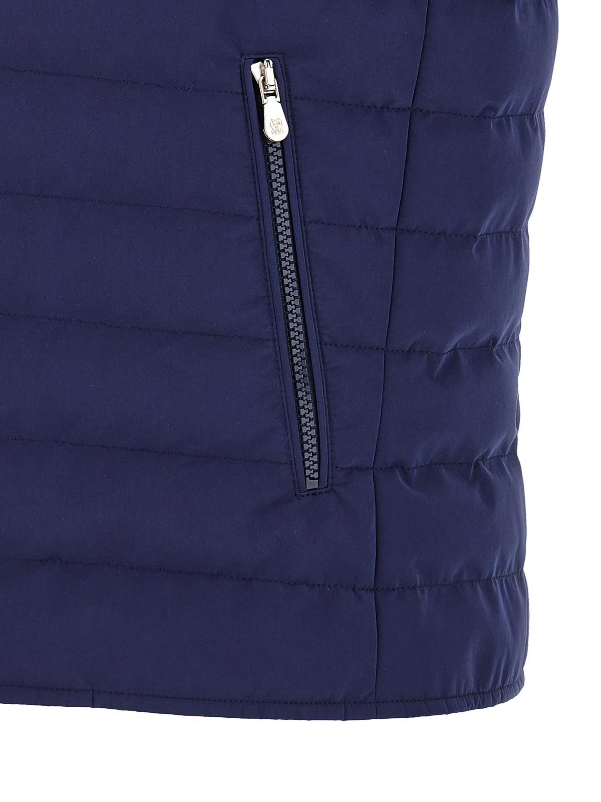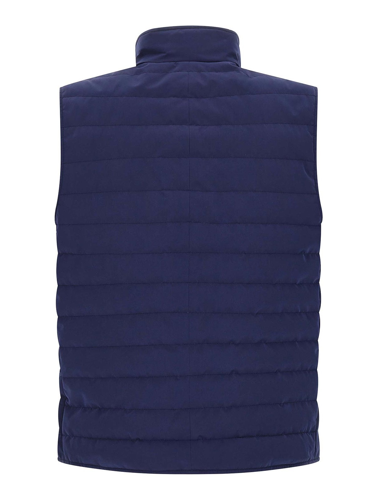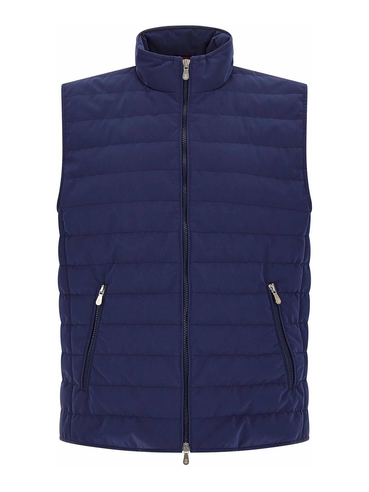 Atmungsaktive und wasserabweisende, gesteppte und leicht mit Gänsefedern gepolsterte Weste aus Membrannylon, wasserabweisendes Nylonfutter, Stehkragen, Frontreißverschluss, Taschen.