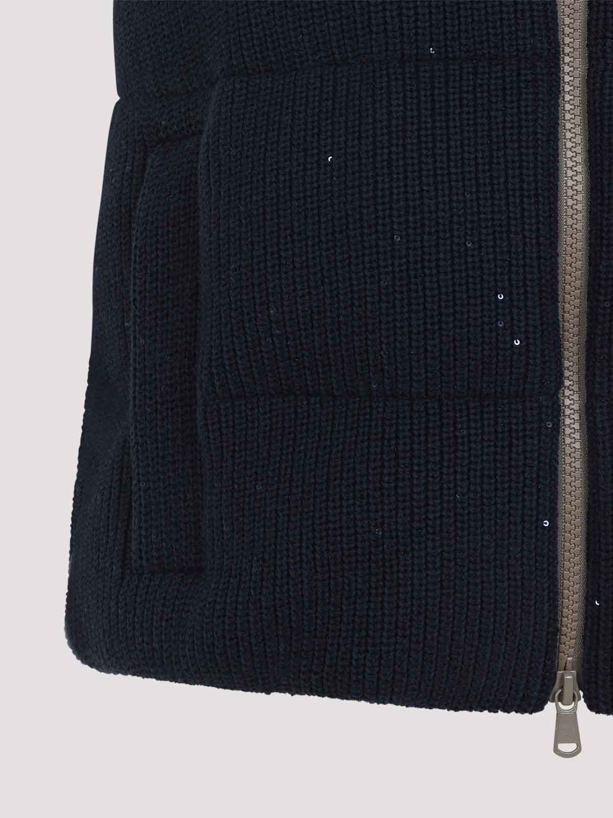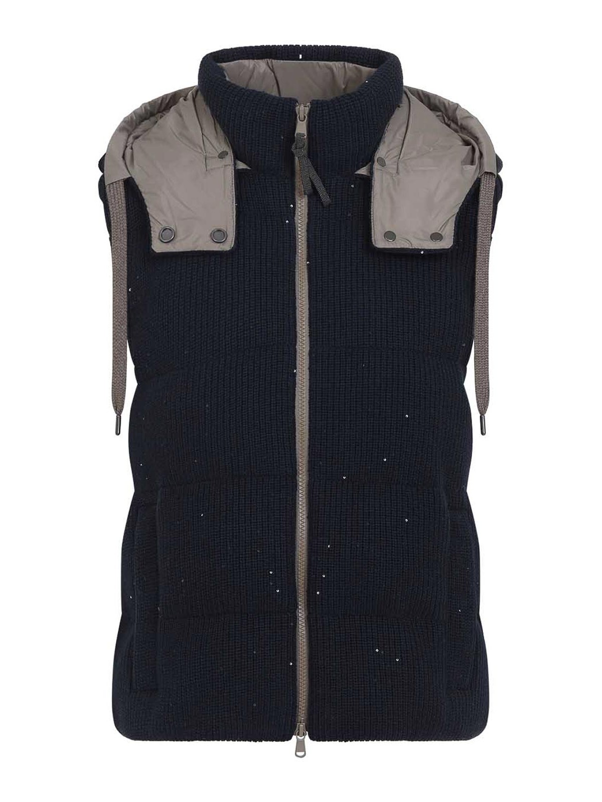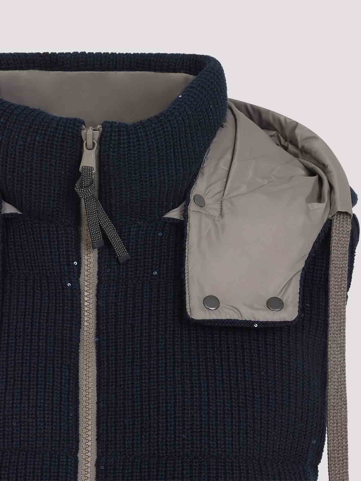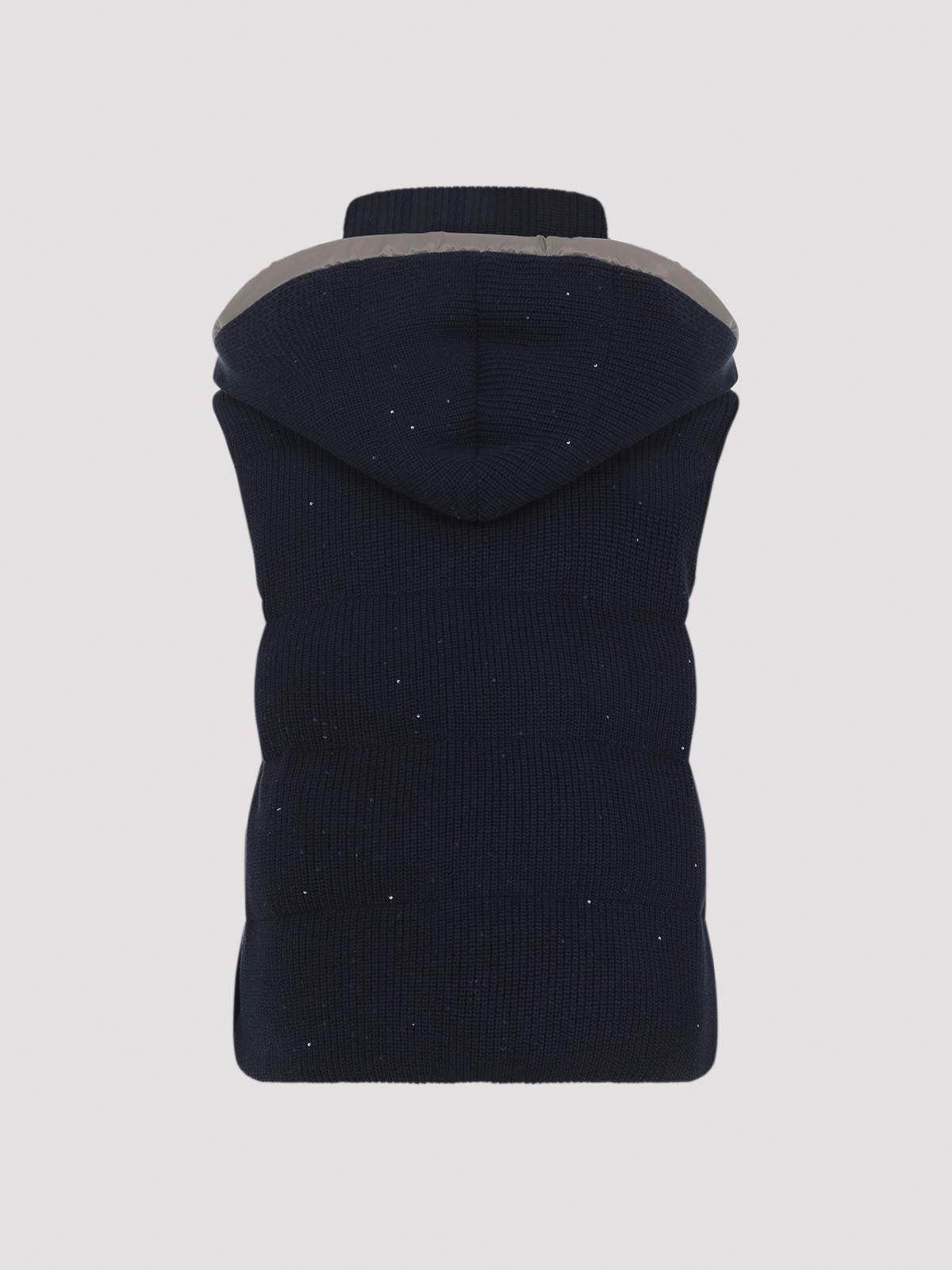 Brunello Cucinelli Abisso-Baumwollweste. Hergestellt aus Abisso-Baumwollgarn, überall feine Pailletten, gestepptes Muster, mit Federn gefüllte, abnehmbare und verstellbare Kapuze, Stehkragen, Frontreißverschluss, zwei Fronttaschen, versteckter Kordelzug am Saum, gefüttert.