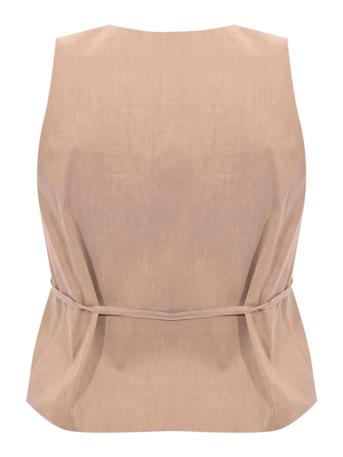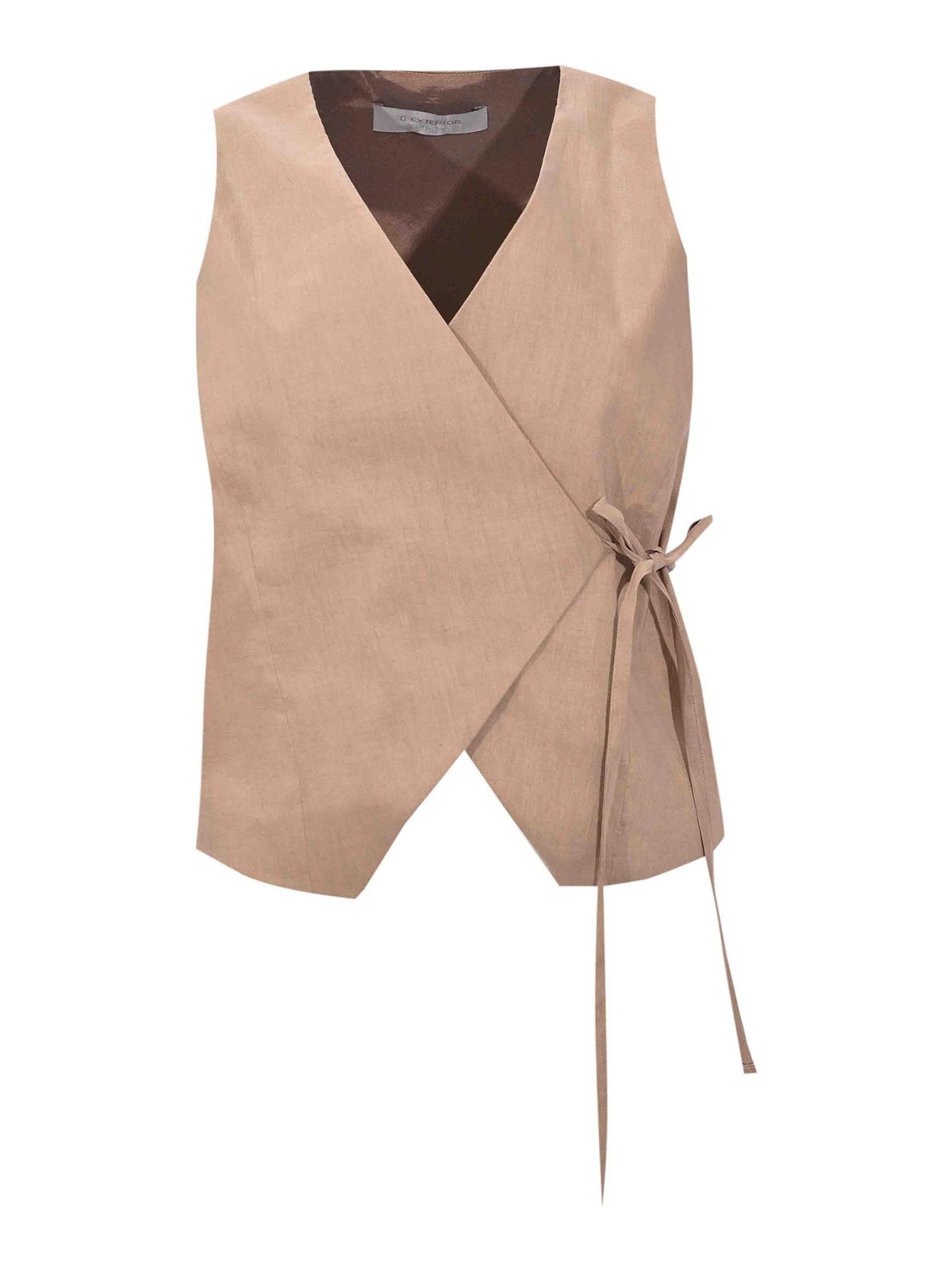 Damenweste aus Stretch-Leinen, Obermaterial, Wickelmodell, Stoff: Stretchleinen, Muster: einfarbig, Ärmel: ärmellos, Kragen: V-Ausschnitt, Verschluss: Wickel mit seitlichen Schnürsenkeln, Taschen: fehlt, Details: gekreuzte Linie, verstellbare Schnürsenkel, asymmetrischer Schnitt an der Unterseite, Futter: nein, Passform: normal