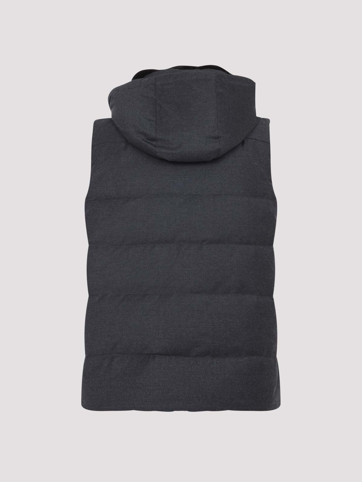 Graue Nerzweste von Yves Salomon gefertigt aus dunkelgrau und Kapuze mit braunem Nerz-Steppmuster, gefüllter Reißverschluss, zwei Seitentaschen, gerader Saum, gefüttert