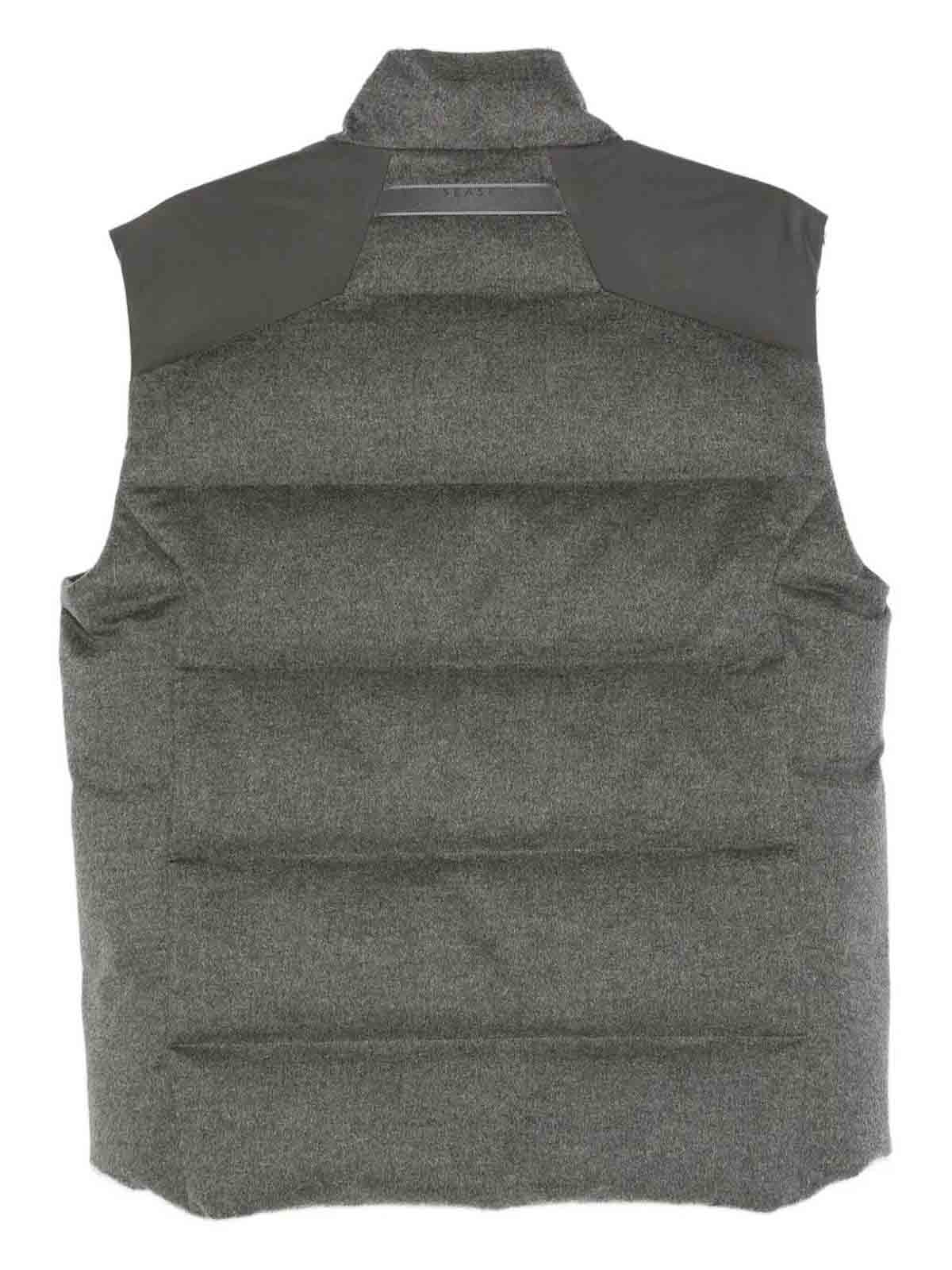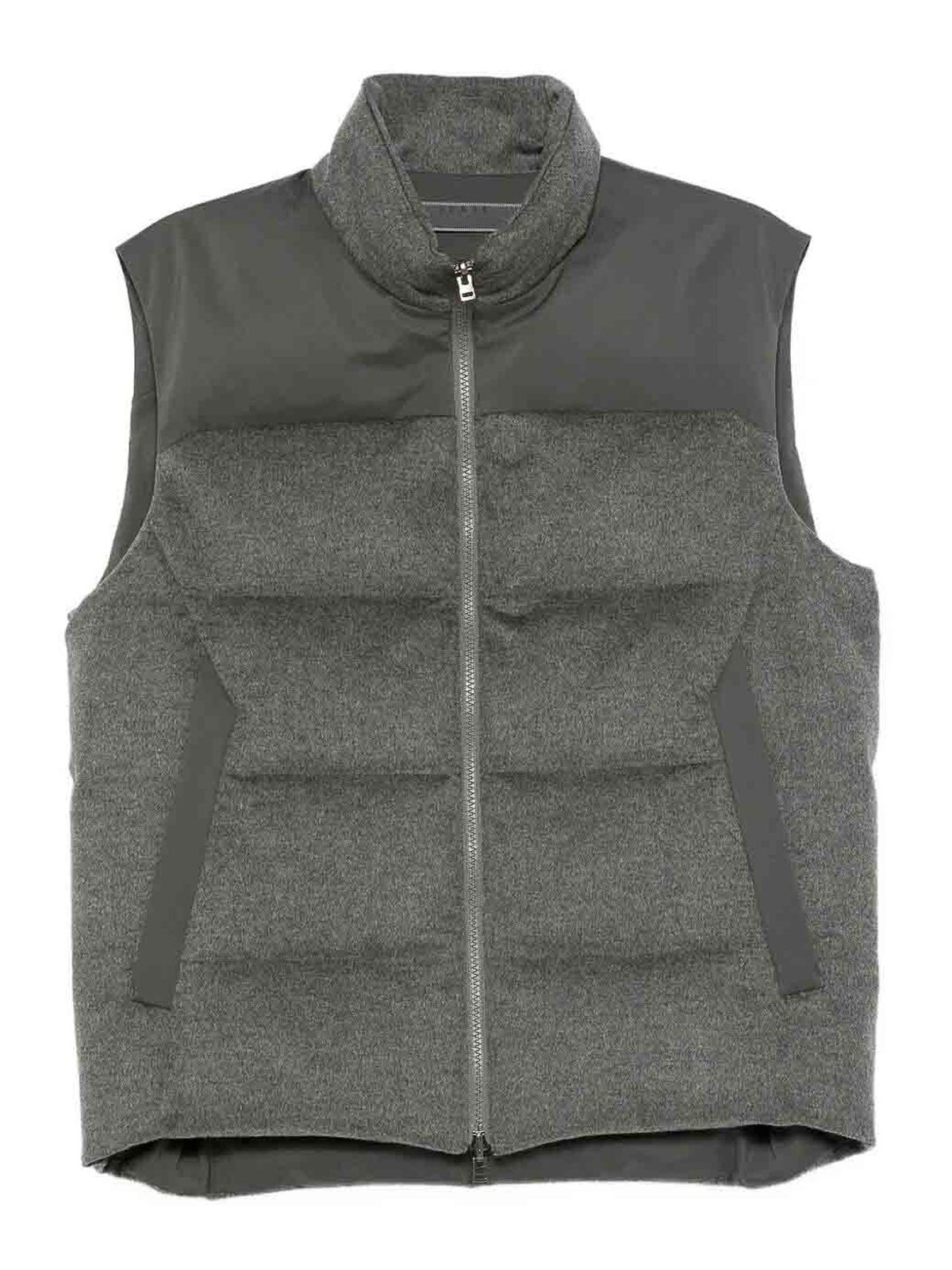 Weste aus 100% recycelter Daune und garngefärbtem Kaschmir, mit Schultern und Details aus weichem Funktionsmaterial mit wasserabweisender Behandlung, das wasser- und windabweisend ist, ohne die Atmungsaktivität zu beeinträchtigen. Das komplett wendbare Design bietet zwei unterschiedliche Looks in einem einzigen Kleidungsstück: Garngefärbtes Kaschmirtuch, Schultern und Details aus wasserabweisendem technischem Material, das wasser- und windfest ist