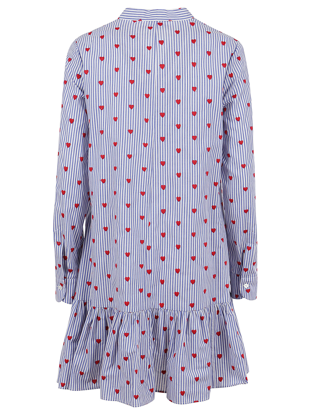 Baumwollkleid von Valentino, rotes Langarmdesign, normale Passform, oberhalb des Knies, Schaldetail am Ausschnitt und Volant an der Unterseite, Streifenmuster und kontrastierende Herzen