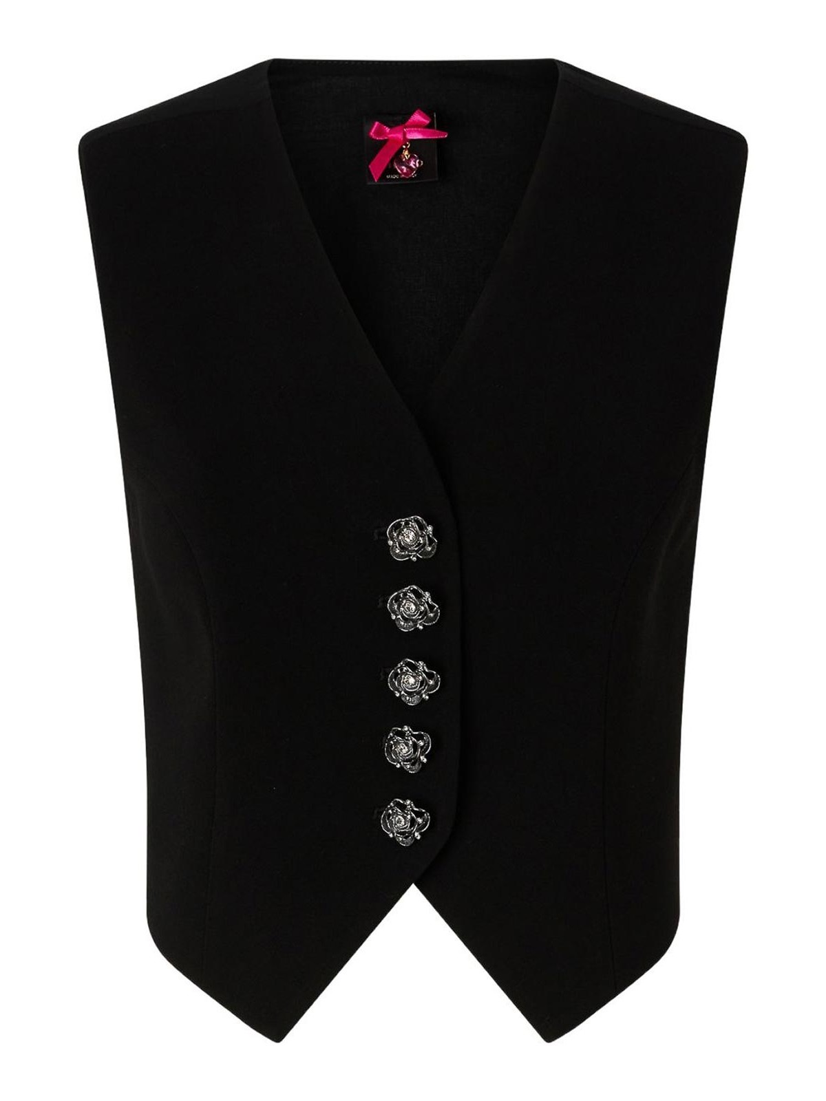 Schwarze Weste von Pinko mit rosafarbenen Knöpfen in oxidiertem Silber, perfekt, um Ihrem Outfit eine elegante und einzigartige Note zu verleihen.