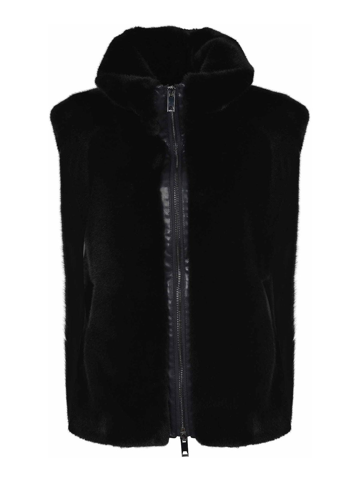 Pinko Deyn Weste aus schwarzem Kunstfell, hoher Kragen. Doppelreißverschluss vorne, Seitentaschen, ärmellos, 100% Polyester.