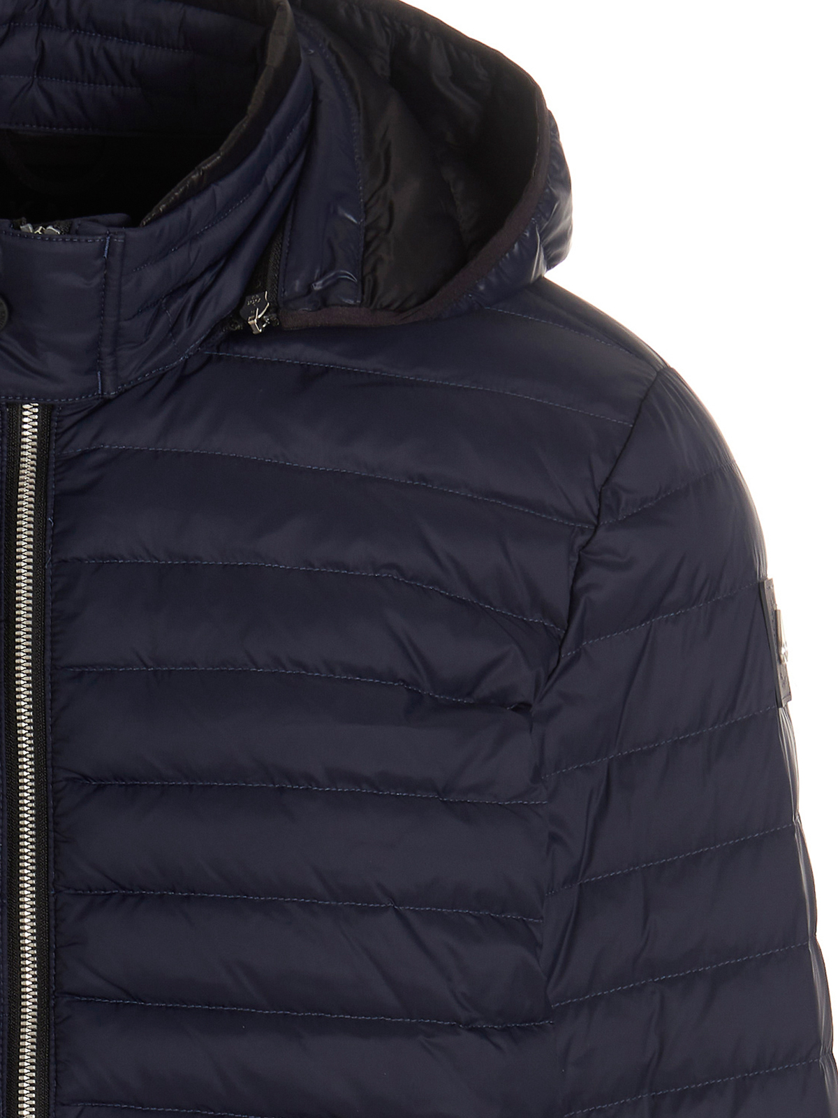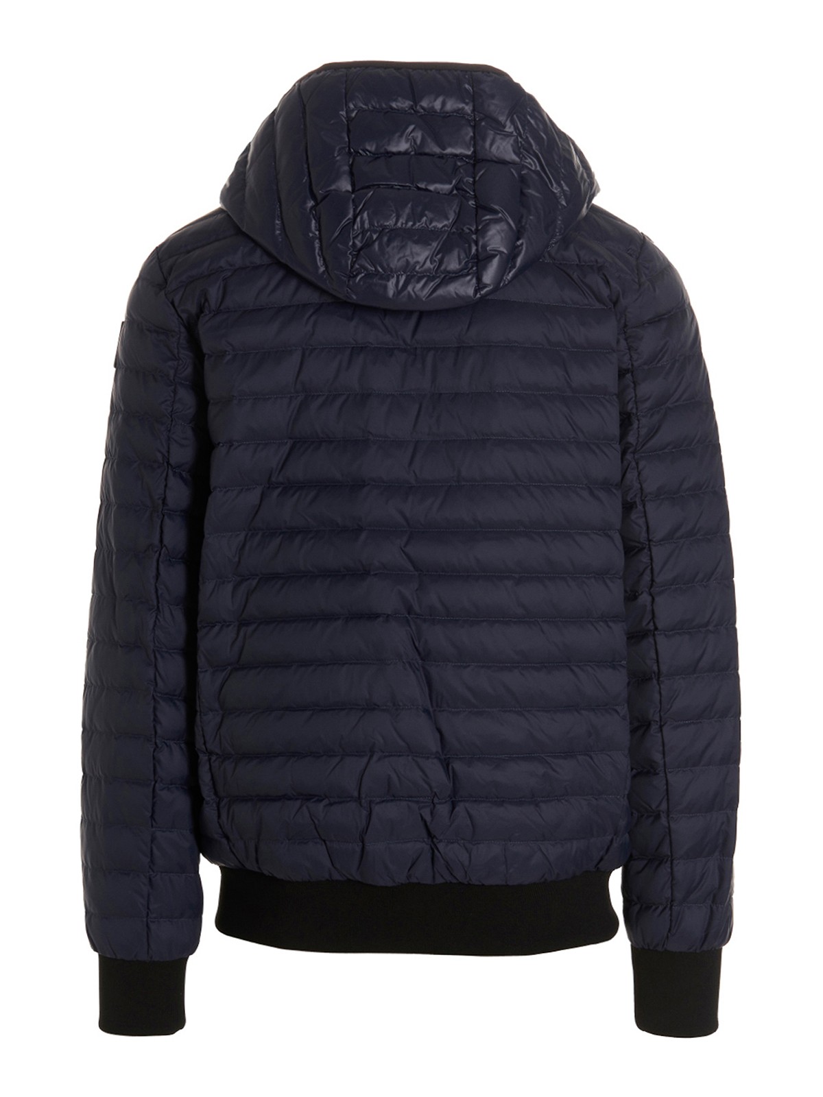 air down bomber' nylon jacket with feather padding zip closure removable hood pockets long sleeves with knitted cuffs logo patch on the sleeve julian sustainable this product is materials