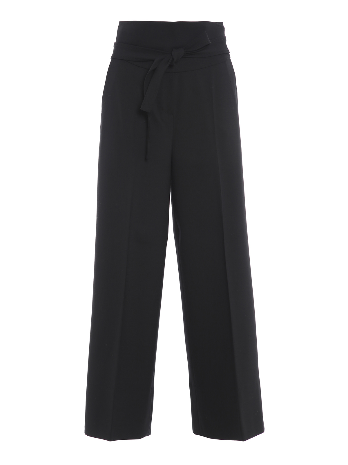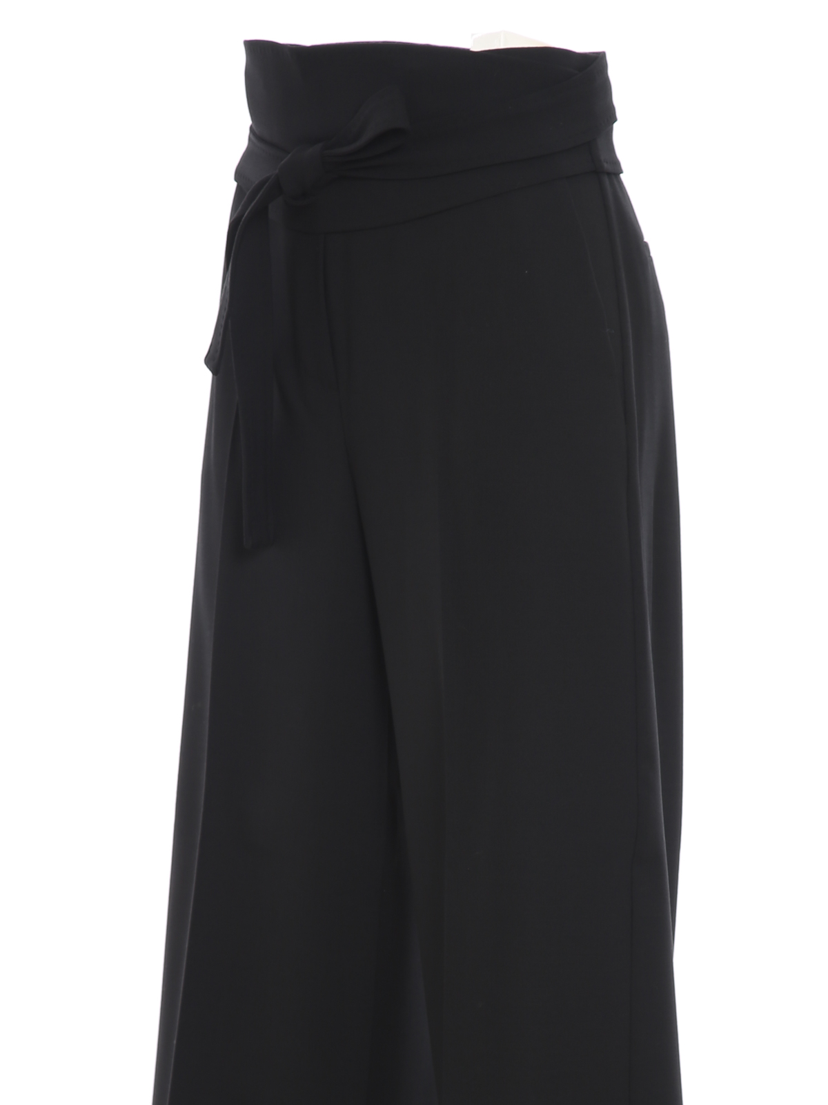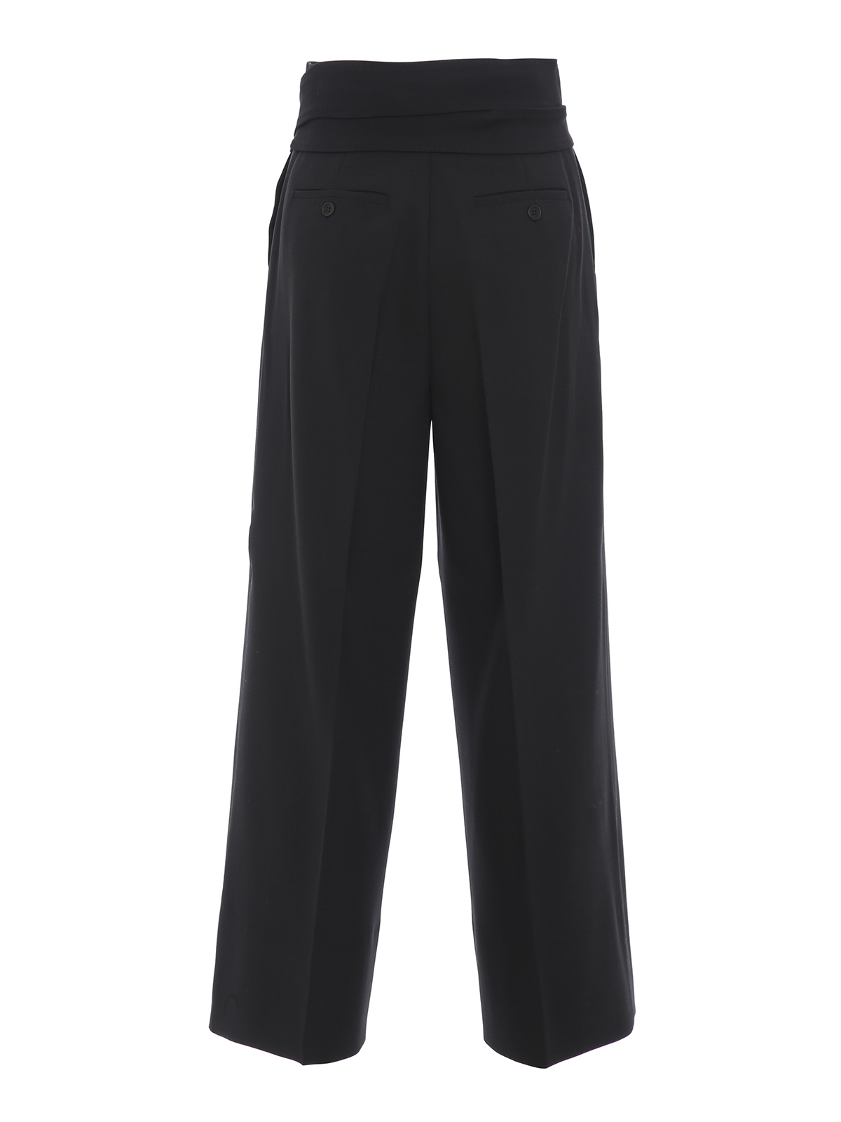 Stretch wool palazzo trousers featuring zip fly, button fastening, high waist, press pleats and waistbands.