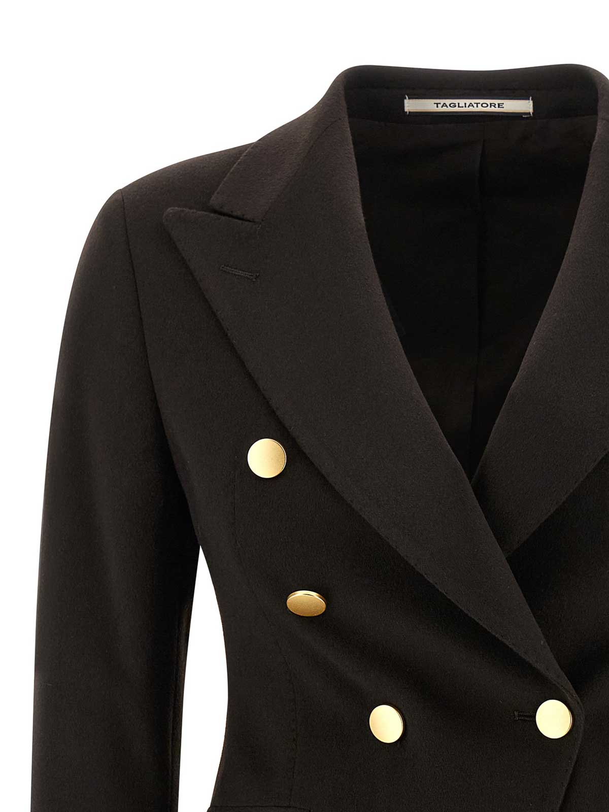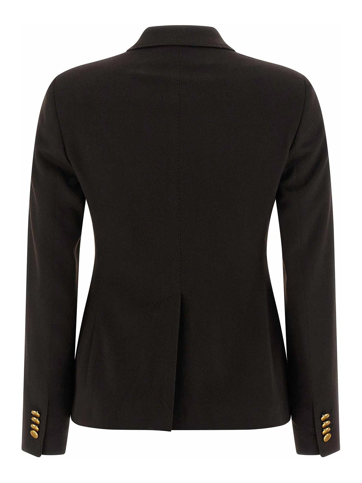 alicya' double-breasted cashmere blazer with front button closure, peak lapels, chest pocket, flap pockets, structured shoulder strap, long sleeves, back split, cupro lining.coloring: very dark brown