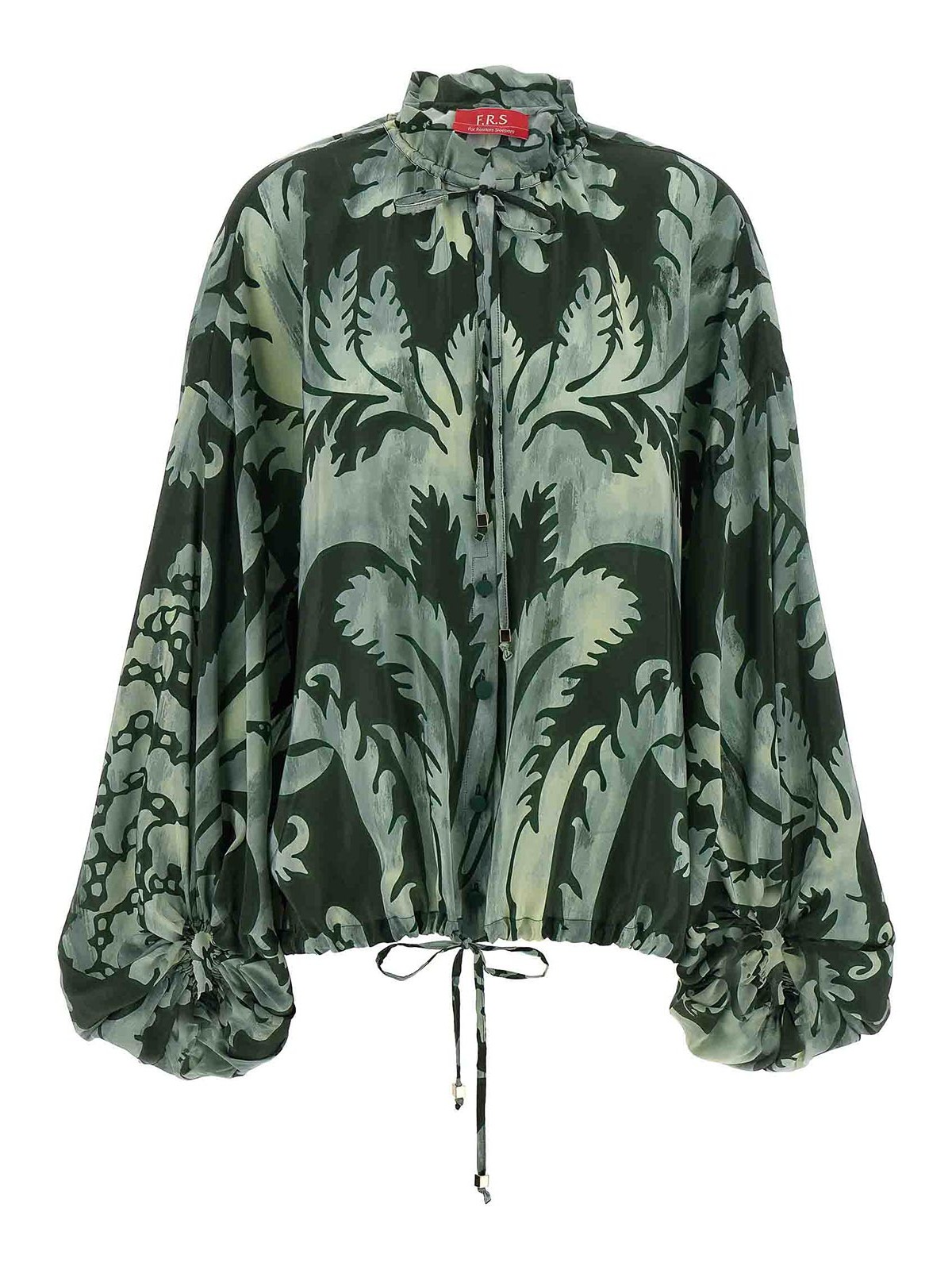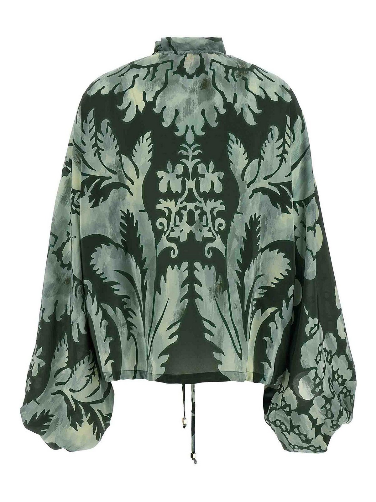 archilo' shirt in light viscose and silk blend with all-over floral print, ruffle collar, adjustable v-neck with drawstring, front button closure, long balloon sleeves with elastic cuffs, drawstring on the hem.