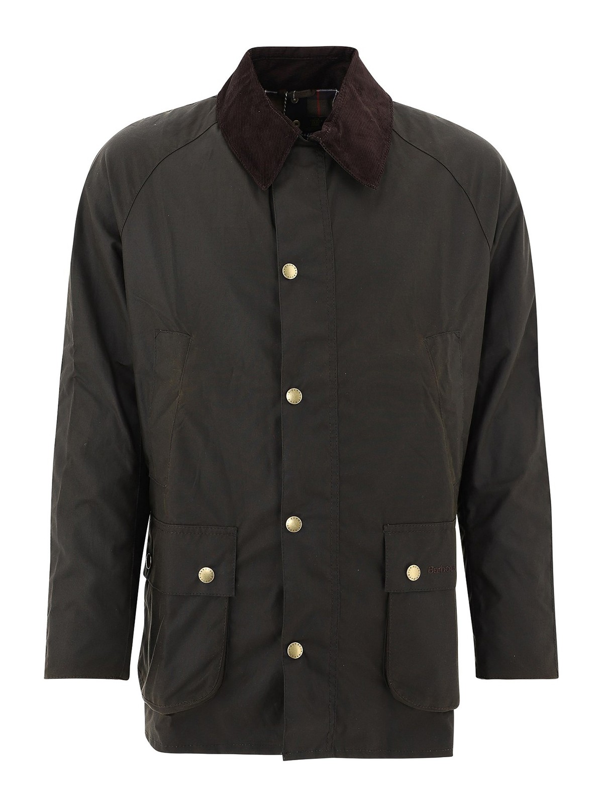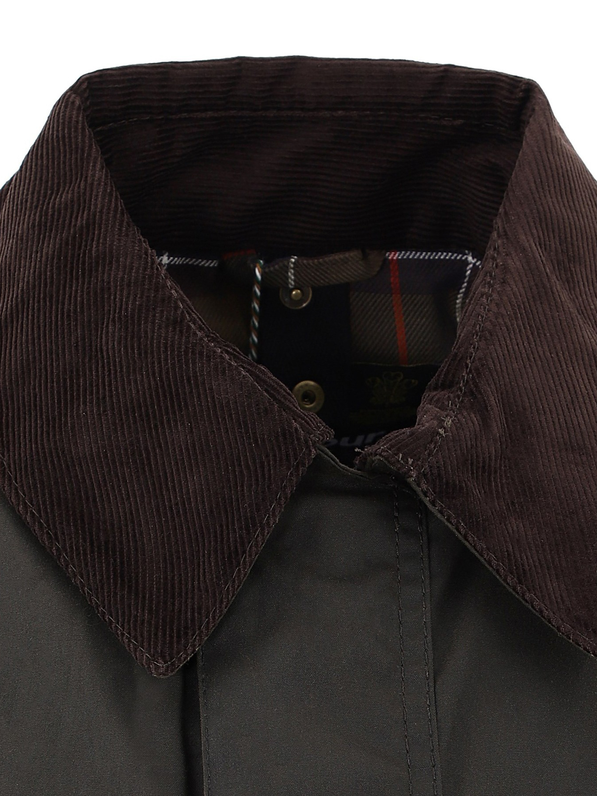 Waxed cotton jacket featuring contrasting corduroy point collar, two slant pockets, two patch snap flap pockets and concealed zip and press-stud fastening. Tartan printed lining.