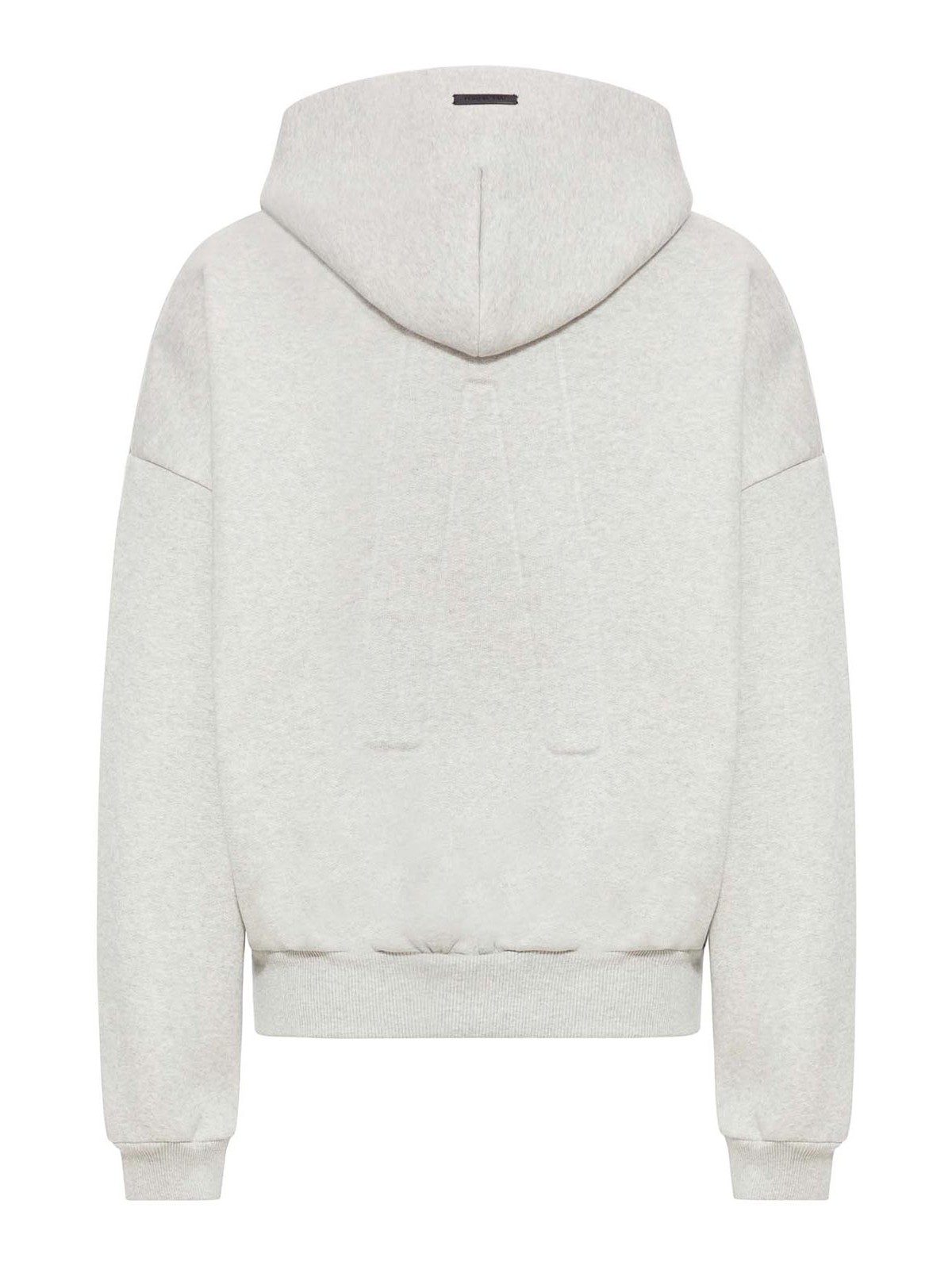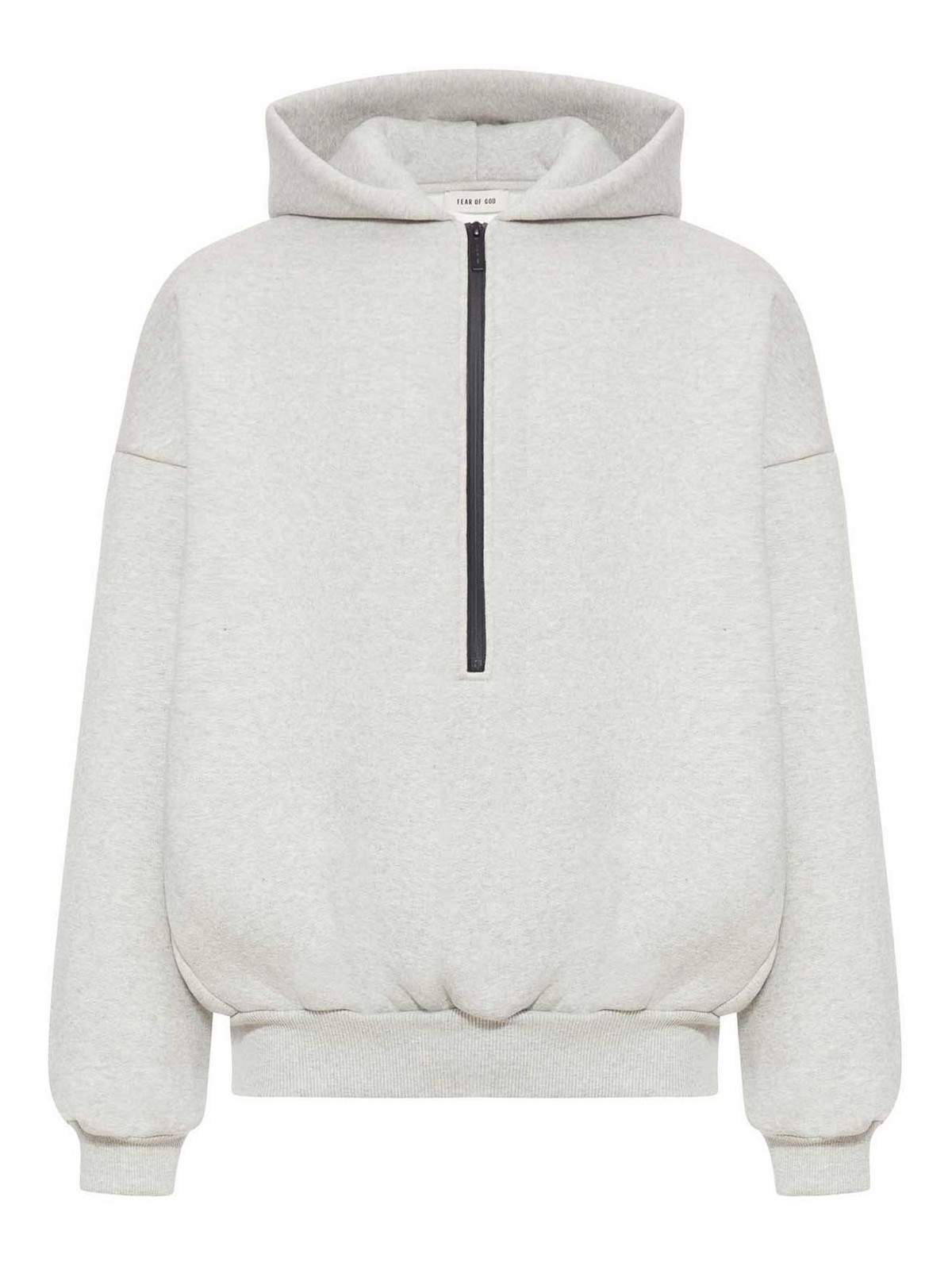 Double-layer hood- dropped shoulders- half-zip, kangaroo pocket- side pockets- embossed a for athletics- ribbed cuffs and waistband- fear of god label- grey