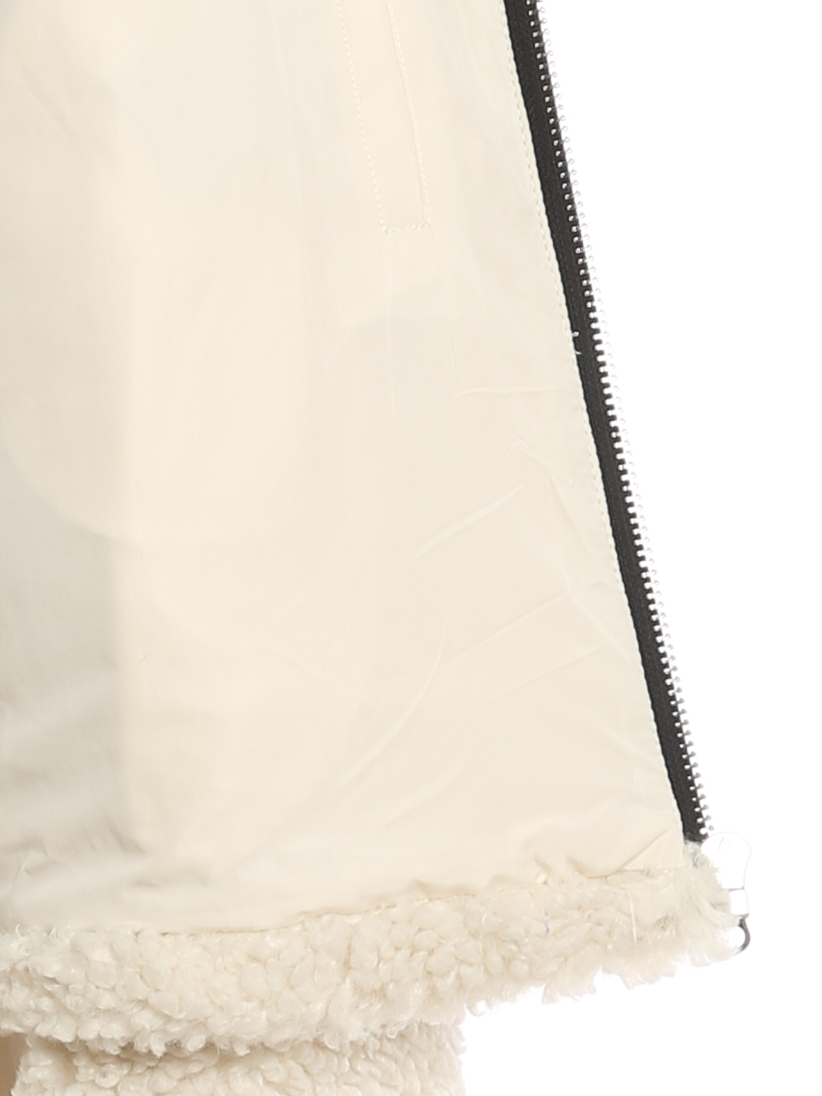 Faux fur jacket featuring contrasting inserts and zip closure.
