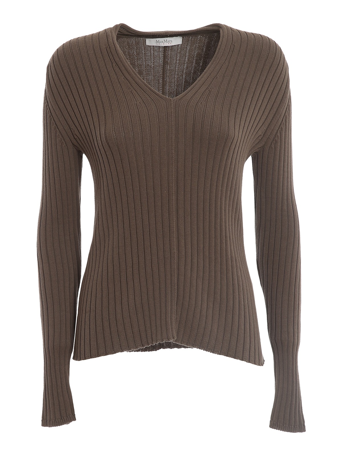 Cotton pull featuring vertical stripe texture, V neckline, long sleeves and curled bottom. Max Mara Leisure.