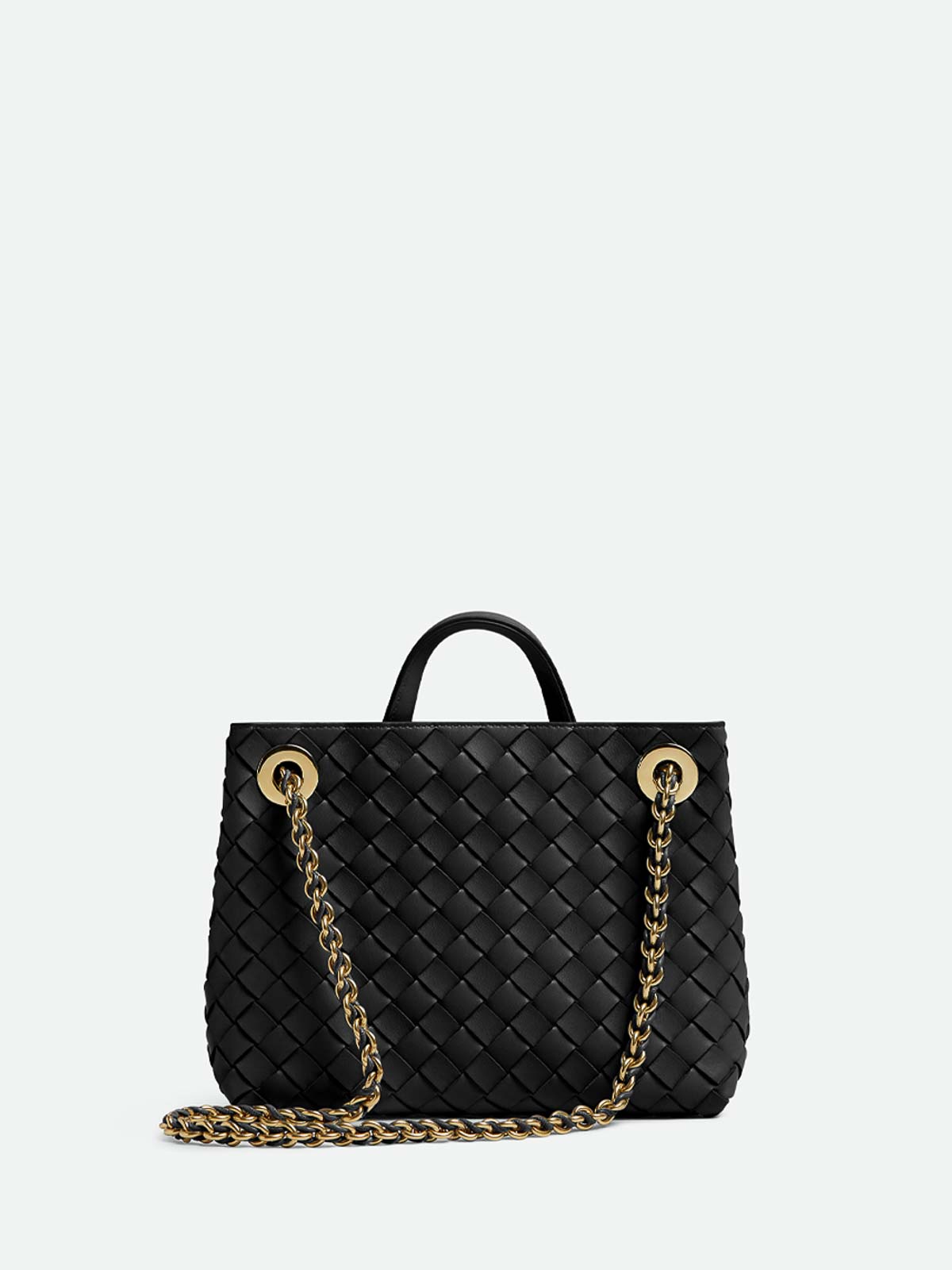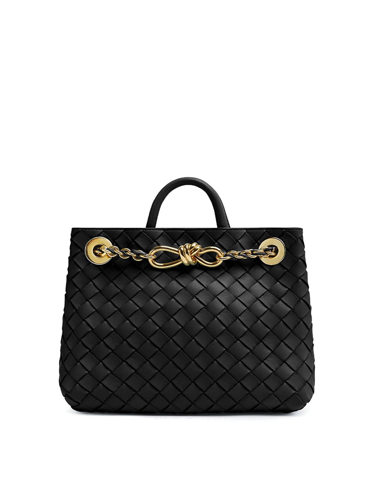 Black lambskin with signature weave design, single rolled handle, leather and chain shoulder strap with knot detail, divided compartment, internal zip pocket, internal front pocket, unlined, gold-tone hardware, hidden magnetic closure.