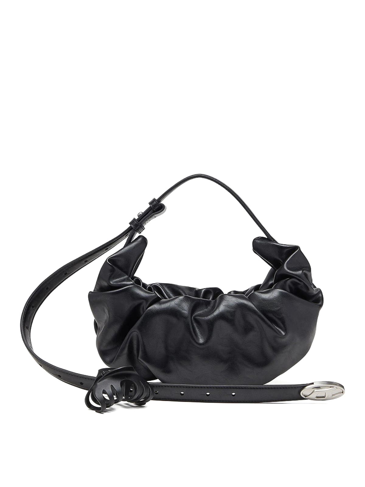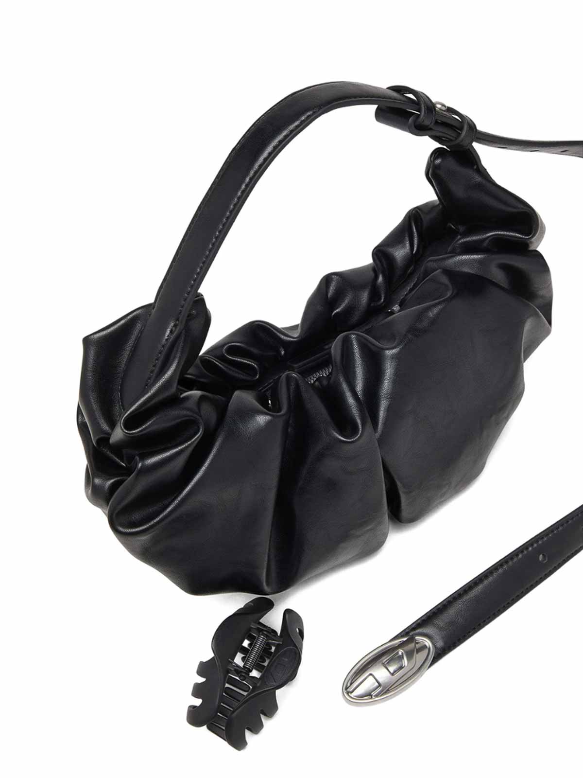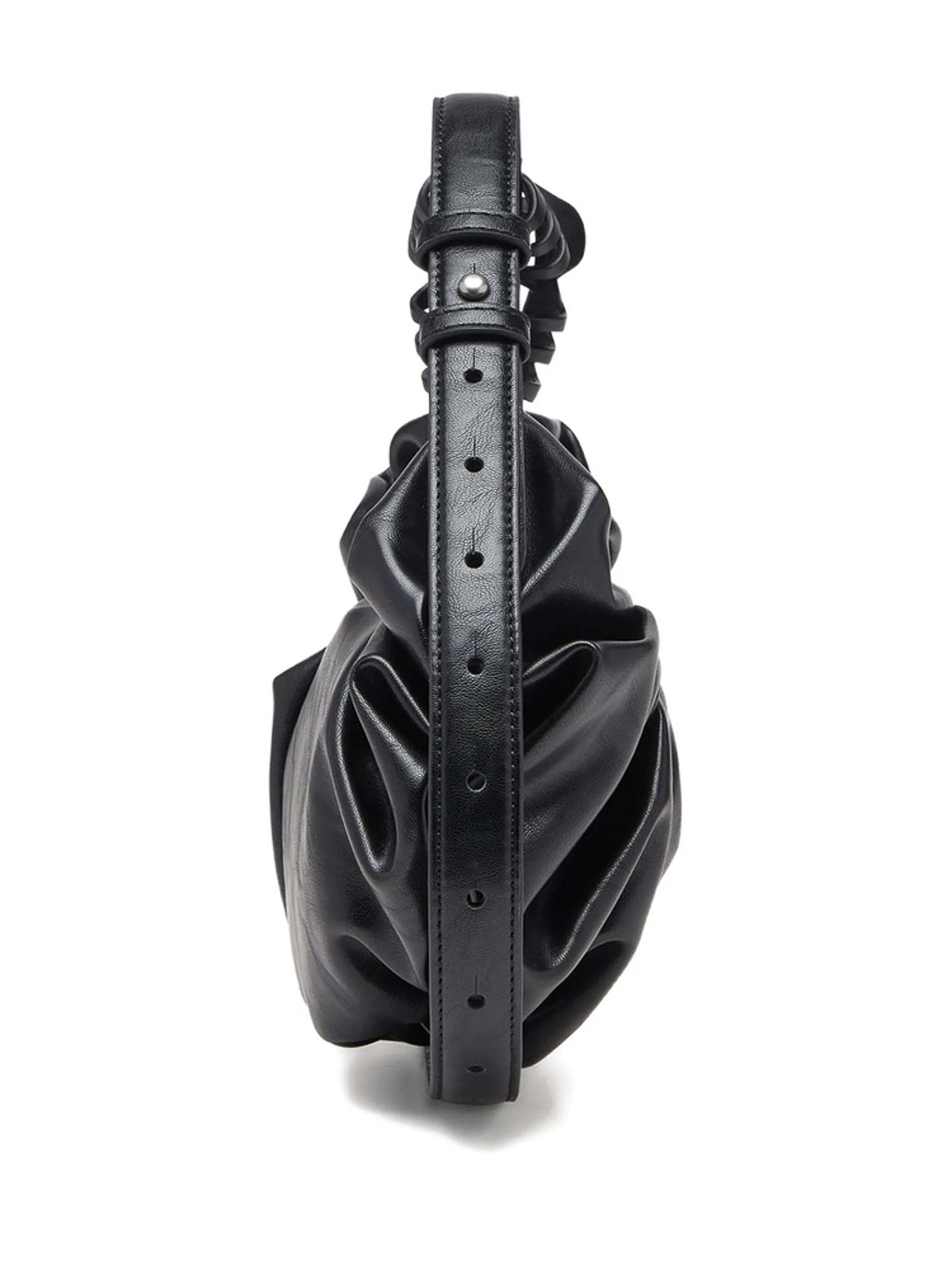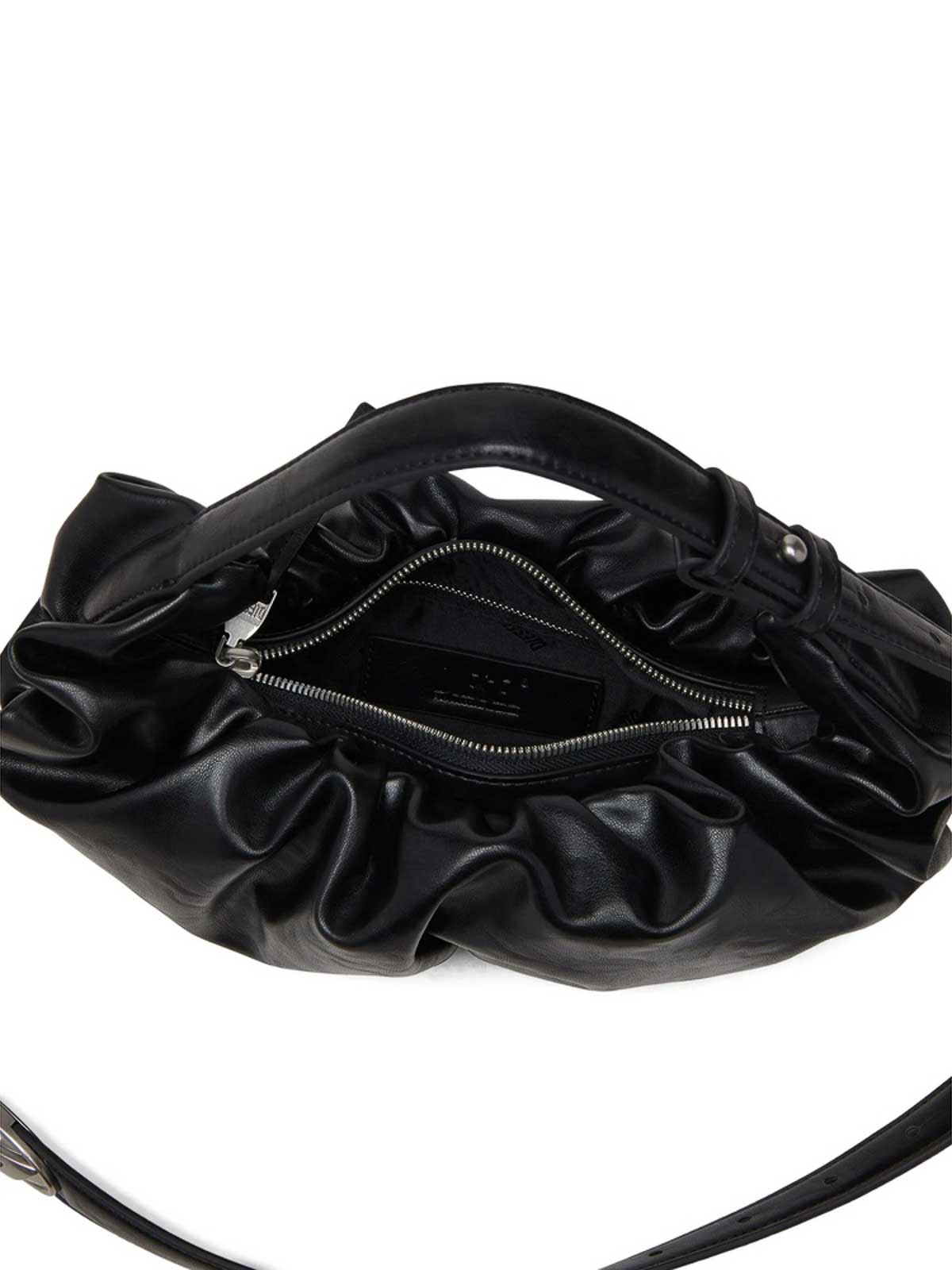 Black scrunched texture zip belt strap, tone buckle zip, top