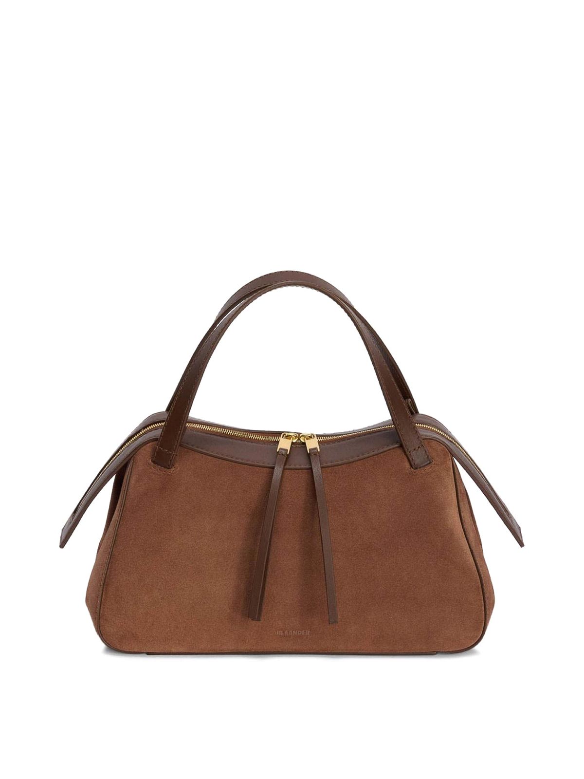 Brown embossed logo double zip puller detachable crossbody strap two top handles