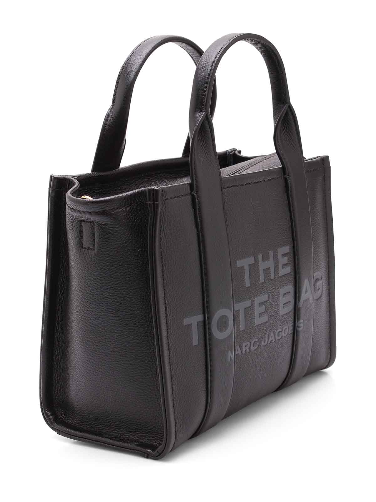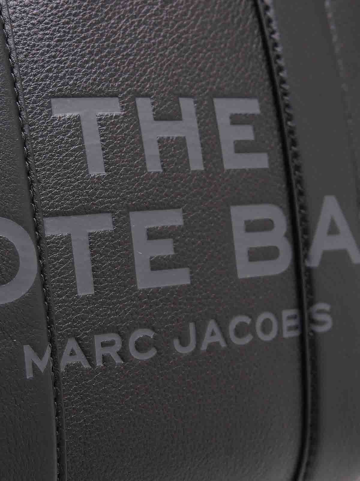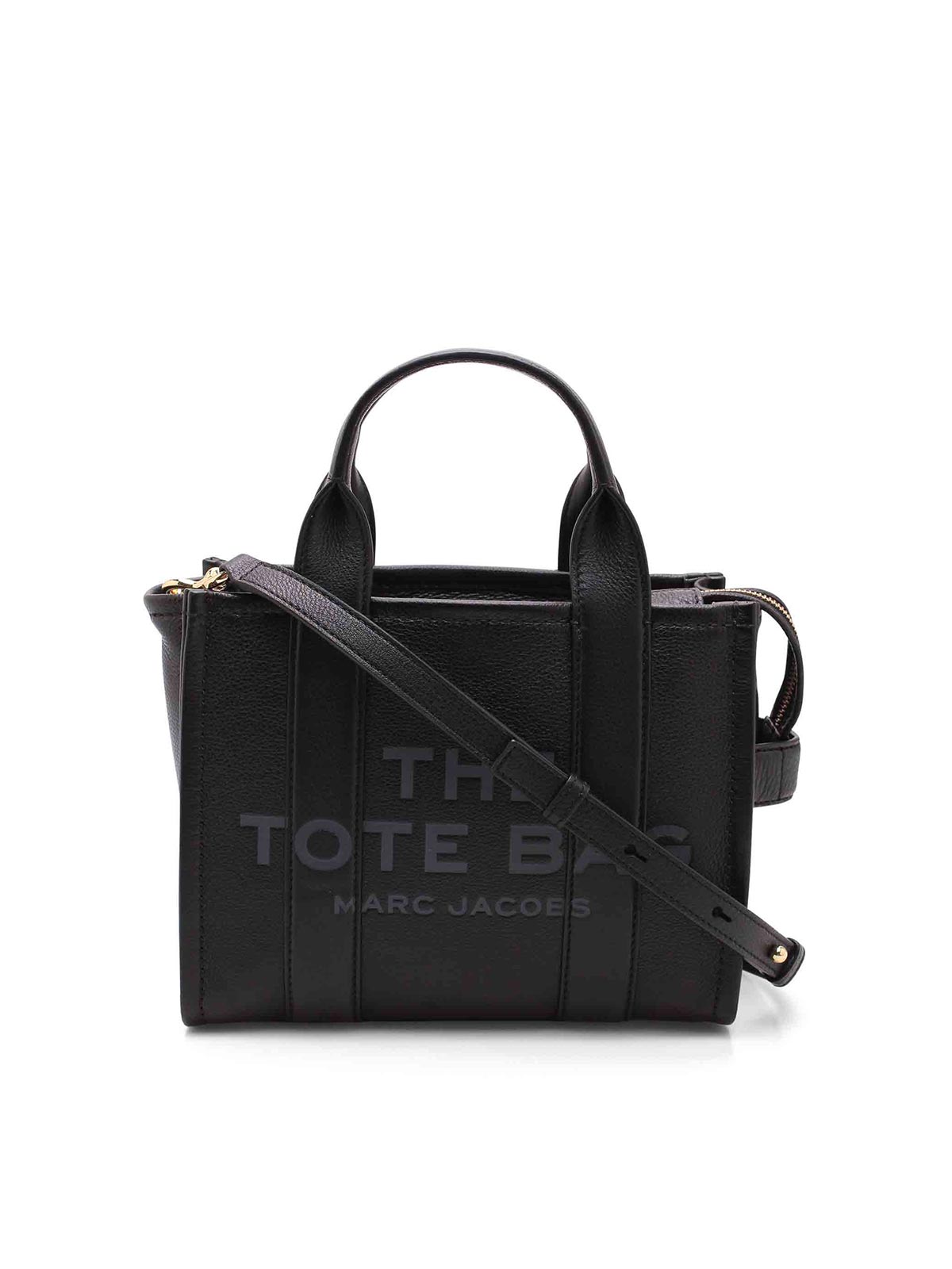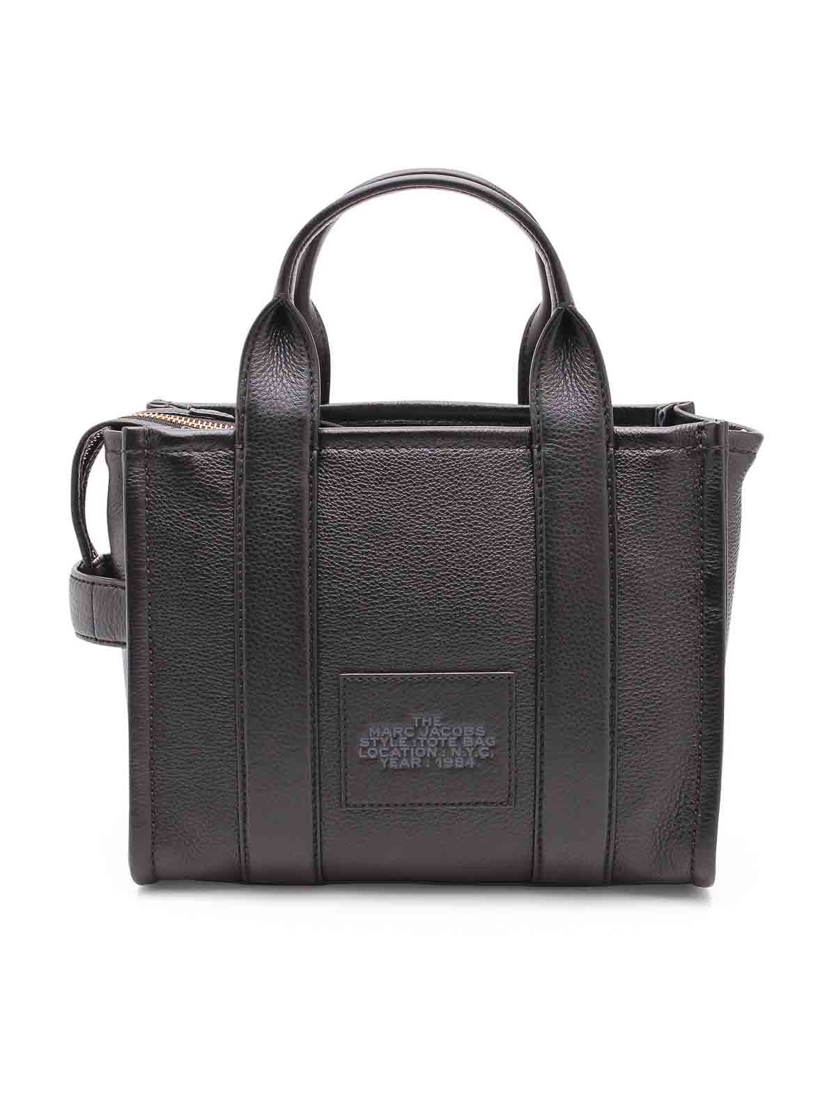 Hand bag 'The traveler mini' in black leather, two round handles, logo print on the front, adjustable and removable shoulder strap, by Marc Jacobs.