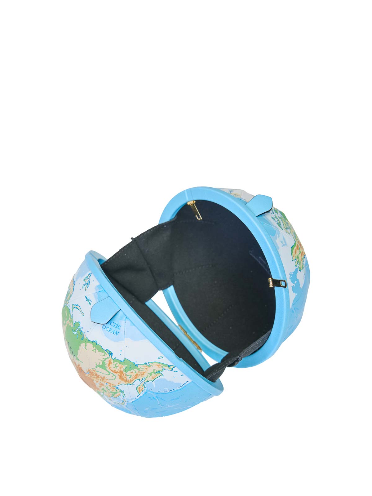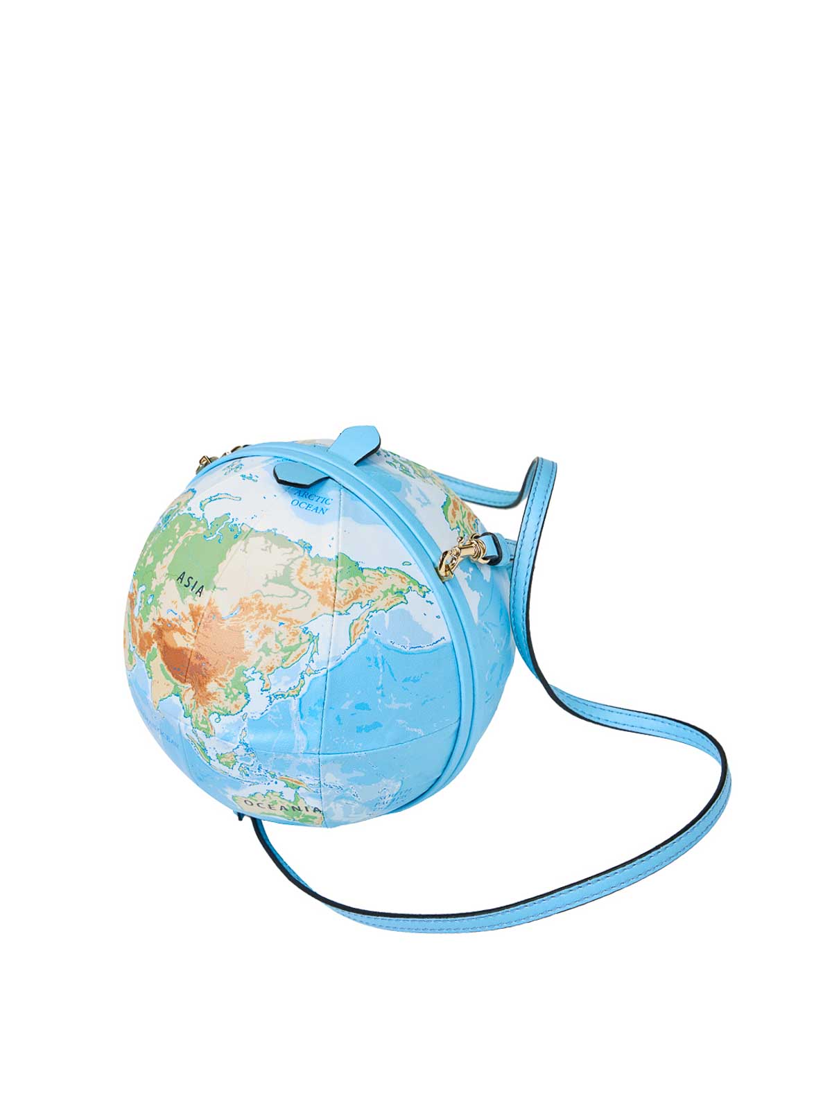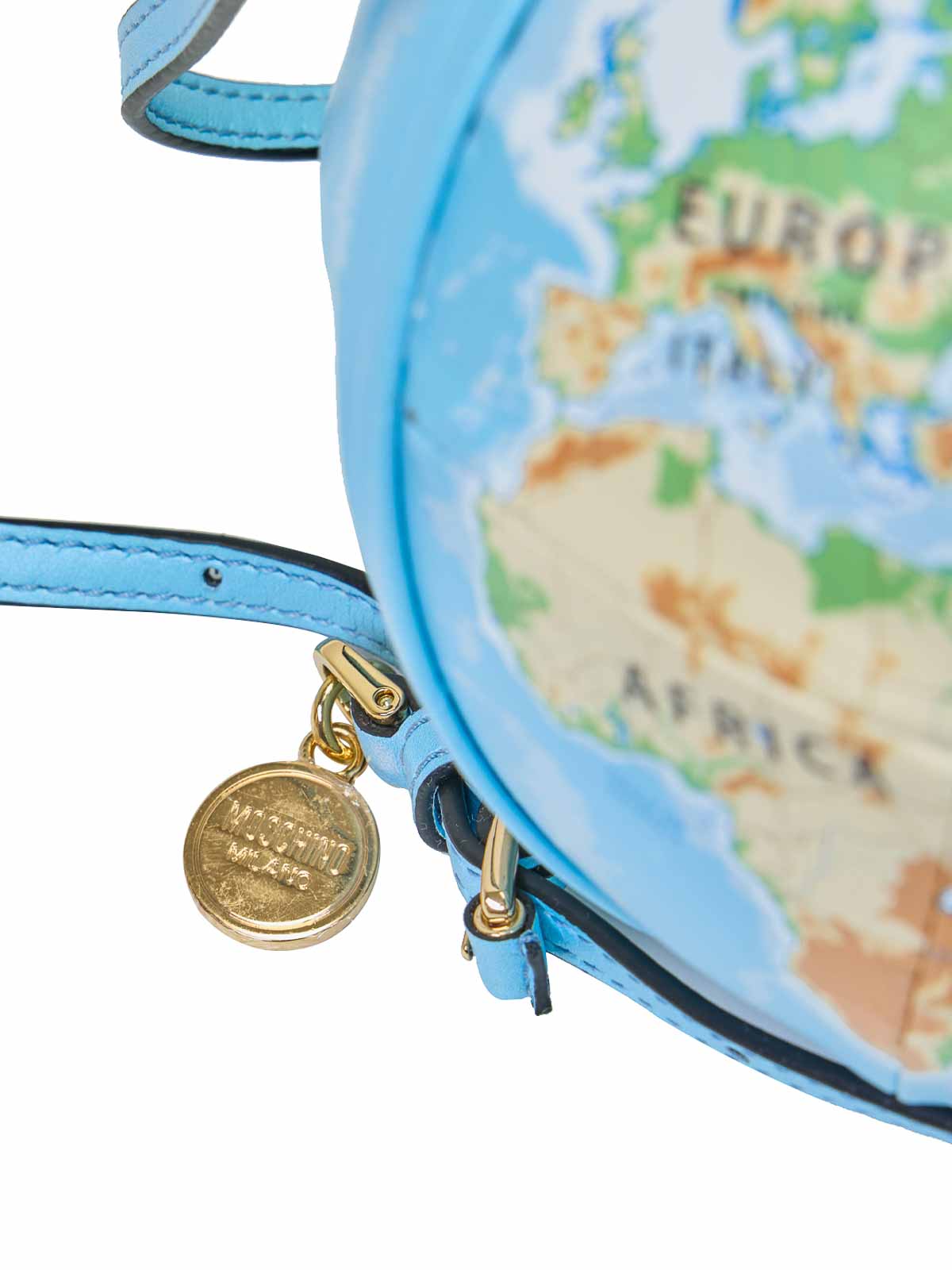 The World Bag in multicolor. Moschino's spherical bag with a printed world map. It features a shoulder strap and snap closure. Spherical design, printed world map, removable shoulder strap, snap closure.