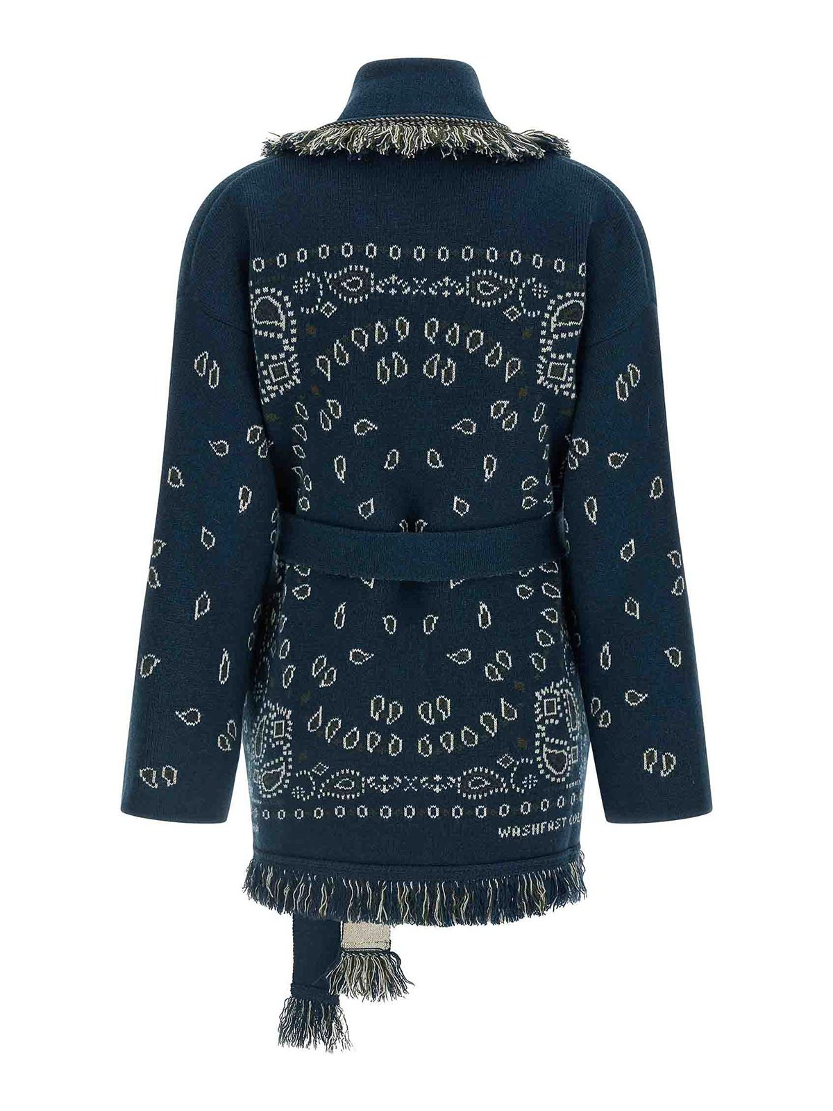 bandana' pure cashmere cardigan with an intricate double jacquard sweater with bandana pattern, robe style, shawl neck, fringes at the edges, pockets, long sleeves, removable belt.