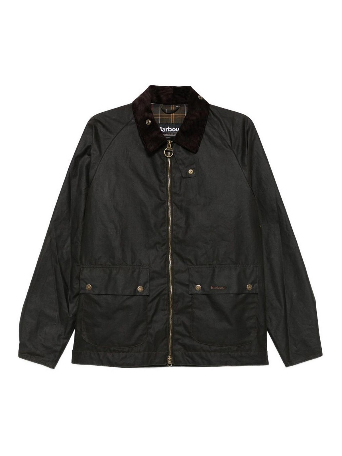 Features olive brown two-way zip button-up hems ribbed collar long sleeves front flap pockets logo motif