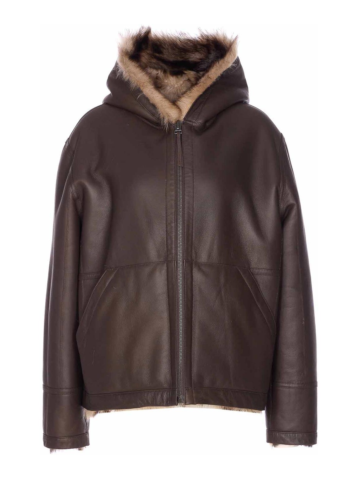 Yves salomon beige and brown reversible jacket with zip closure on the front, hood detail, long sleeves, pockets
