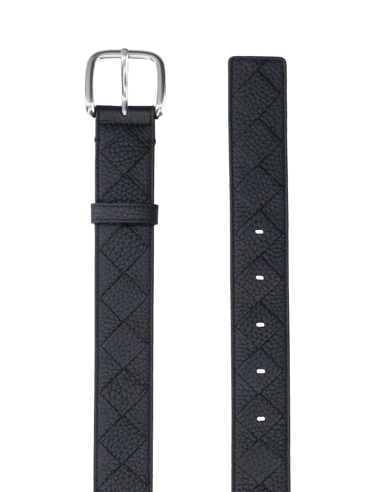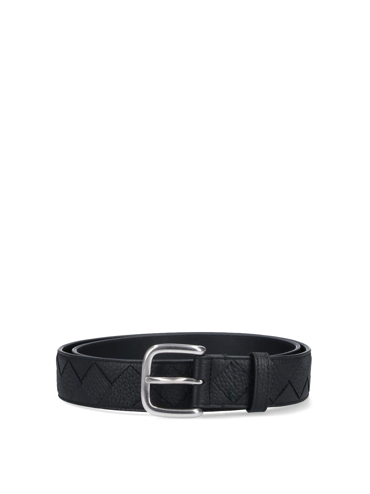 Bottega Veneta taurillon belt, in black textured leather, intrecciato motif, silver metal buckle on the front, adjustable.