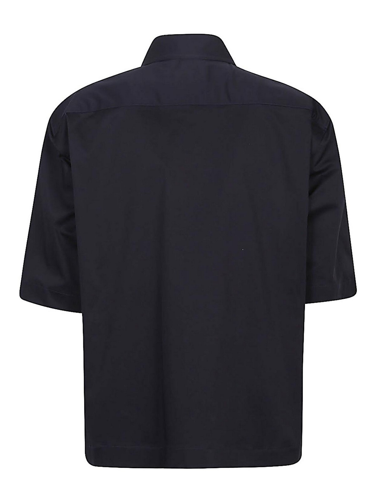 Blue shirt, short sleeves, jewel button closure, straight hem.