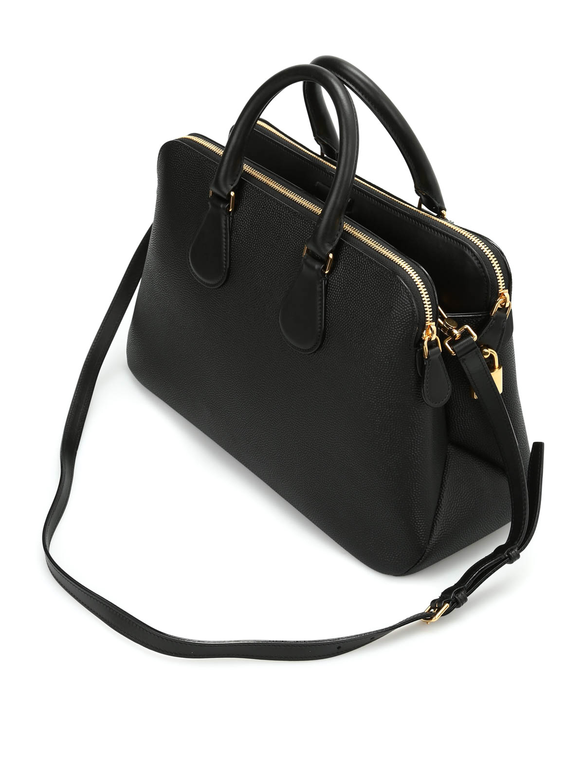 Hammered calf skin tote featuring double padded handle, adjustable and detachable shoulder strap, front and back zipped slots and two central open slots with magnetic closure, front gold-tone metal logo lettering, keyholder charm, side lock, cotton lining, one inner zip pocket and five protective metal feet.