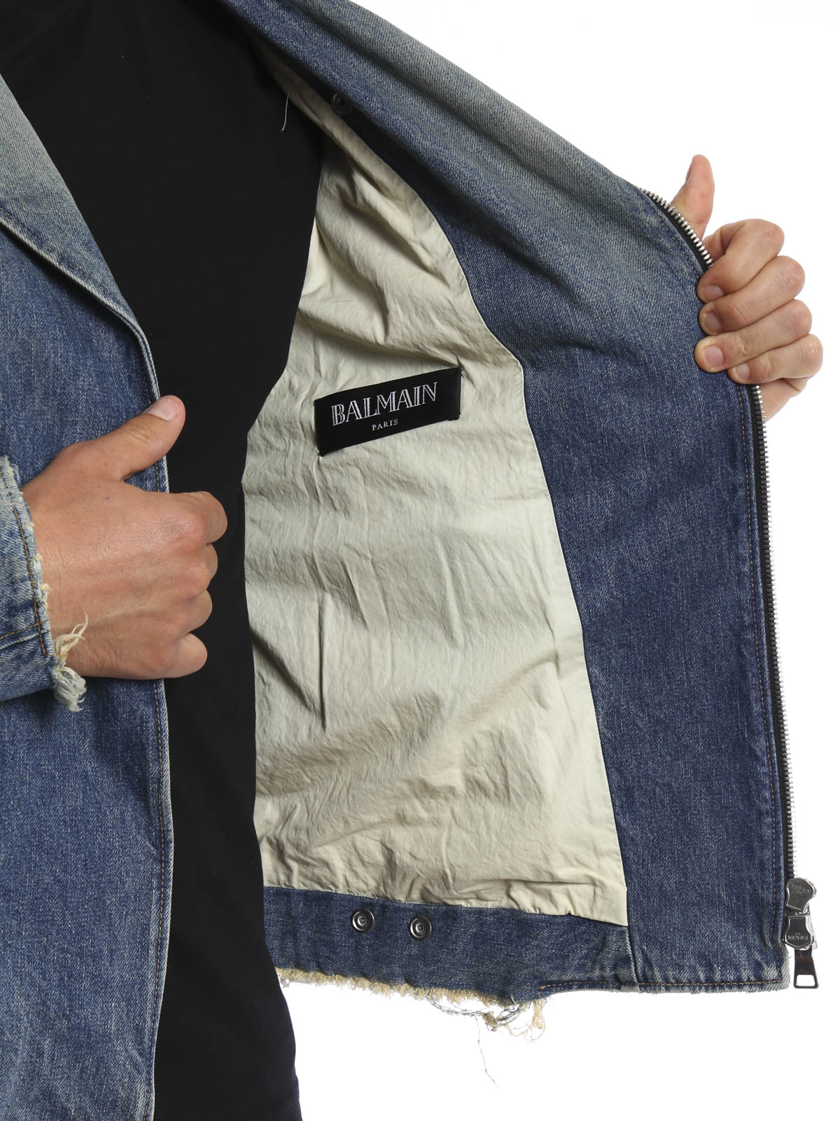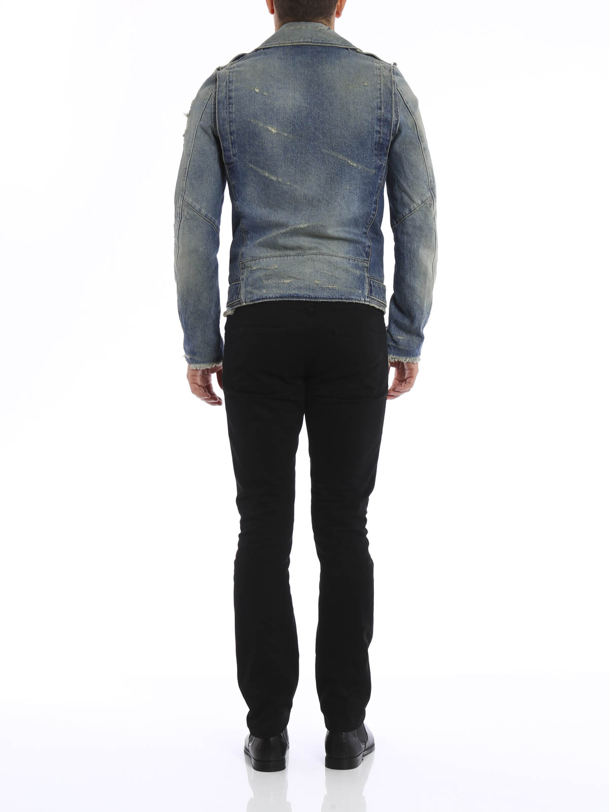 Biker-inspired cotton denim jacket detailed with wash effect and all-over fake scraping, snap epaulettes, asymmetrical zip fastening featuring snap collar, one zip chest pocket, two zip front pockets, snap adjustable straps at waist and zip adjustable cuffs. Fully lined.