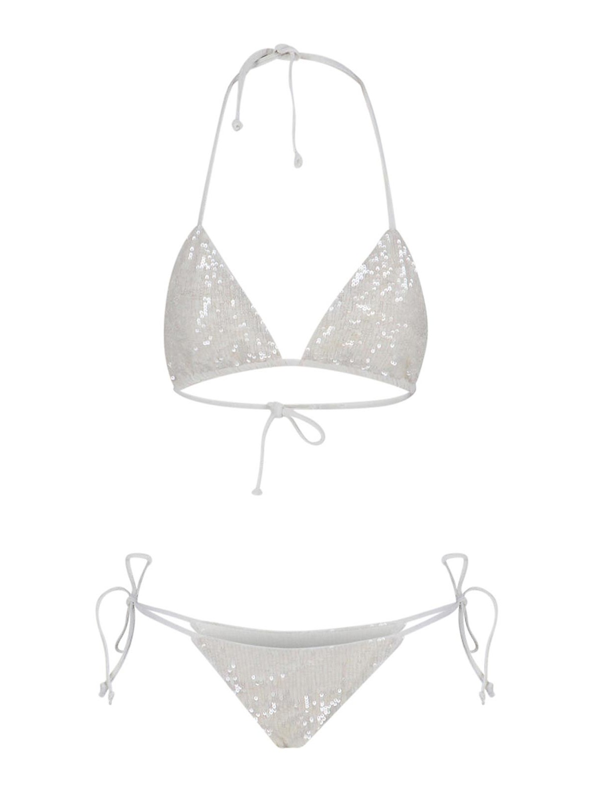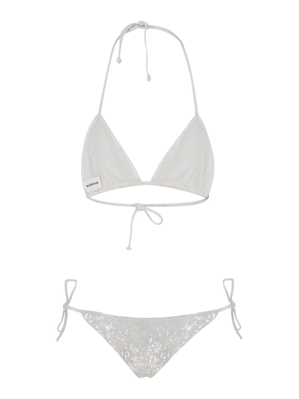 Bikini with sequins p.a.r.o.s.h. in white fabric, all-over sequins applied, triangle design top, adjustable upper laces, classic elasticated briefs and adjustable laces, logo pouch.