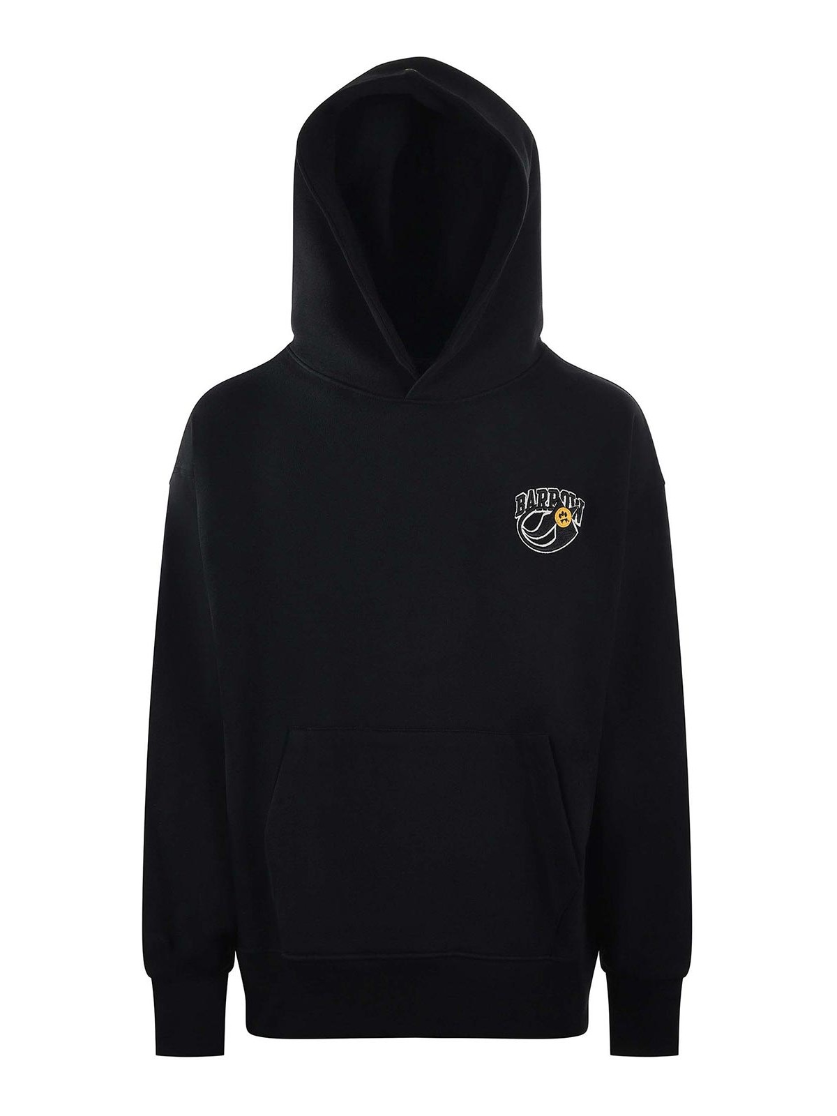 Black cotton barrow sweatshirt. hood. kangaroo pockets. long sleeves. ribbed cuffs and hem. embroidered front logo. large print on the back. brushed interior. size shown in photo: m 100% cotton
