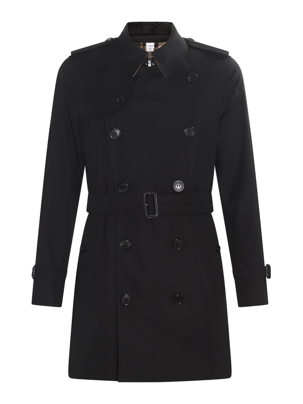 Black wimbledon trench coat from burberry featuring long sleeves fitted double breasted beige check motif adjustable belt at waist and tone-on-tone