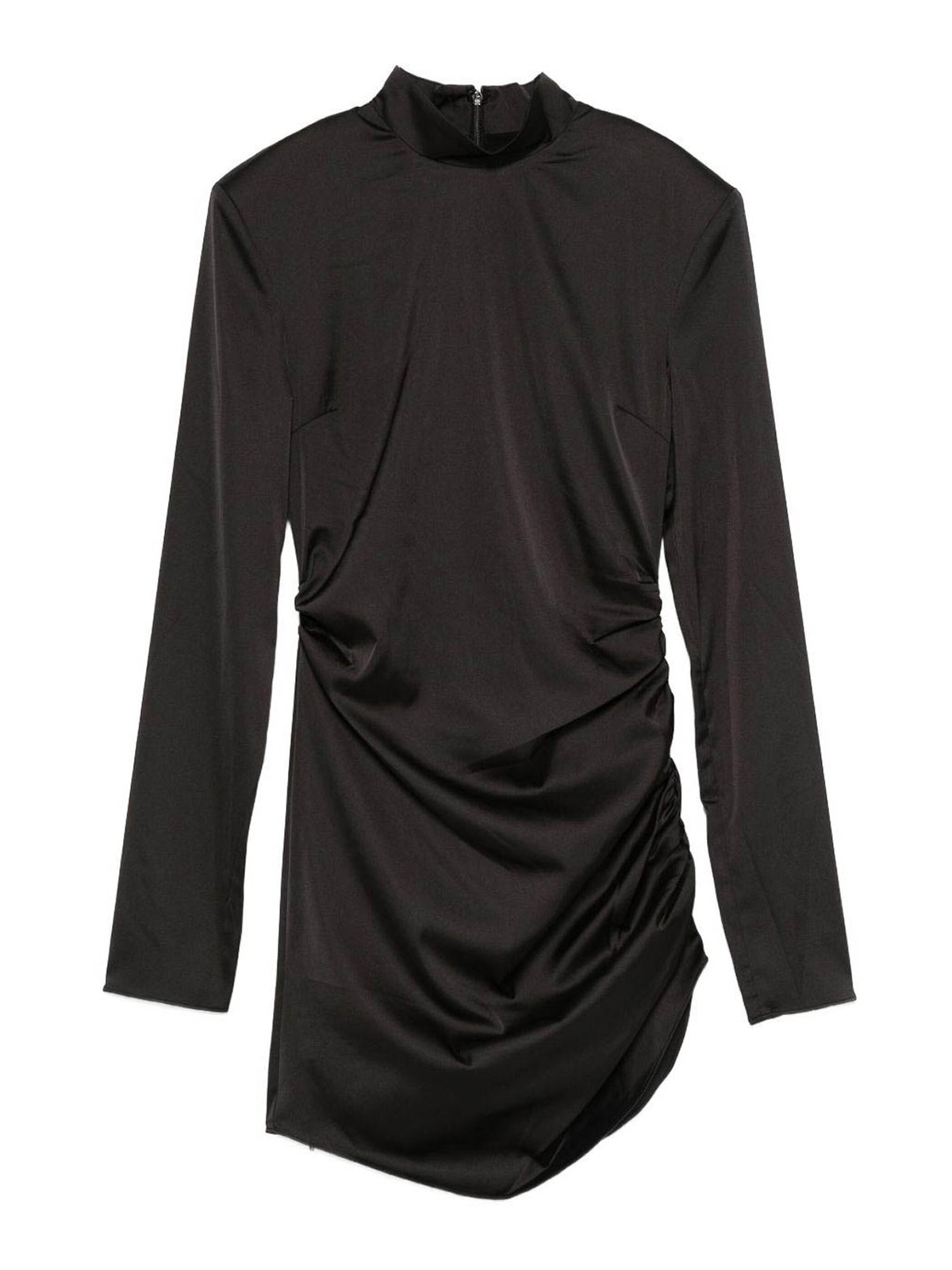 Black ruched mini dress from rotate featuring a high neck long sleeves and rear zip a sophisticated and figure-flattering piece ideal for evening events or special occasions
