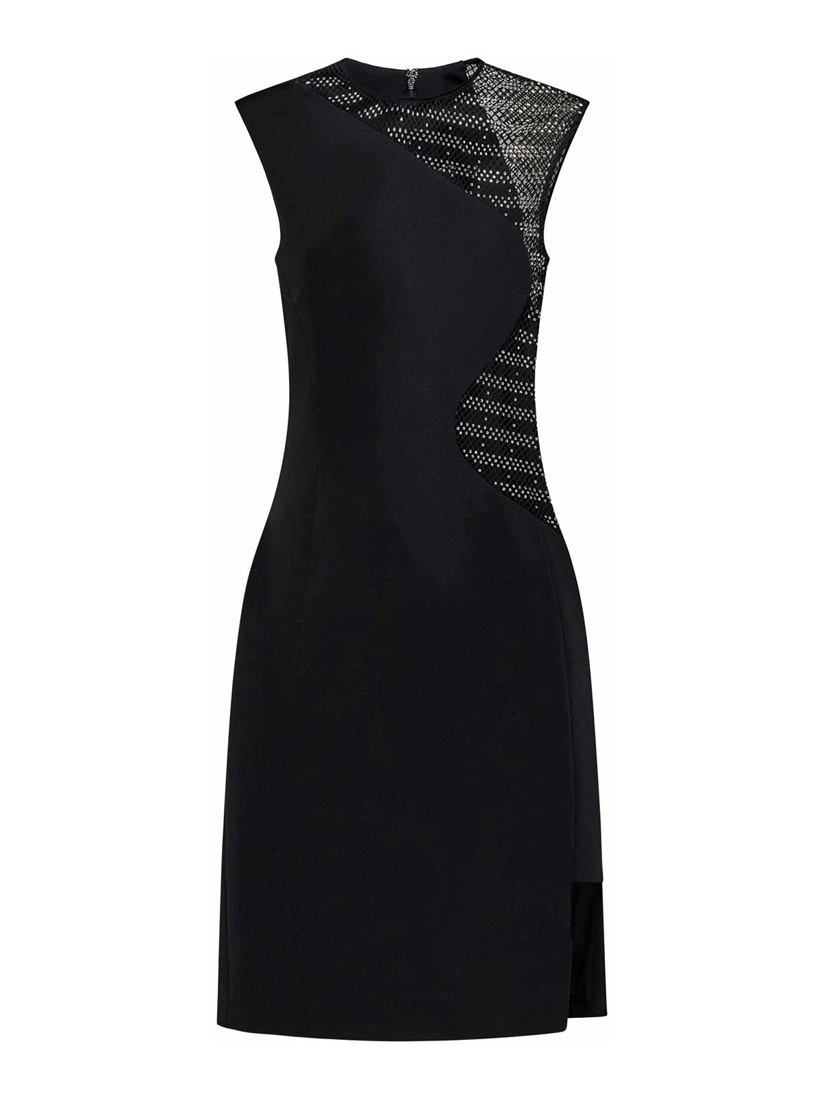 Zip on the back crew neck sleeveless mesh from left shoulder to waist with embedded side slit short and fitted cut black colour
