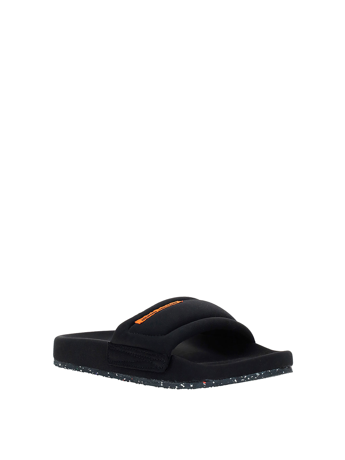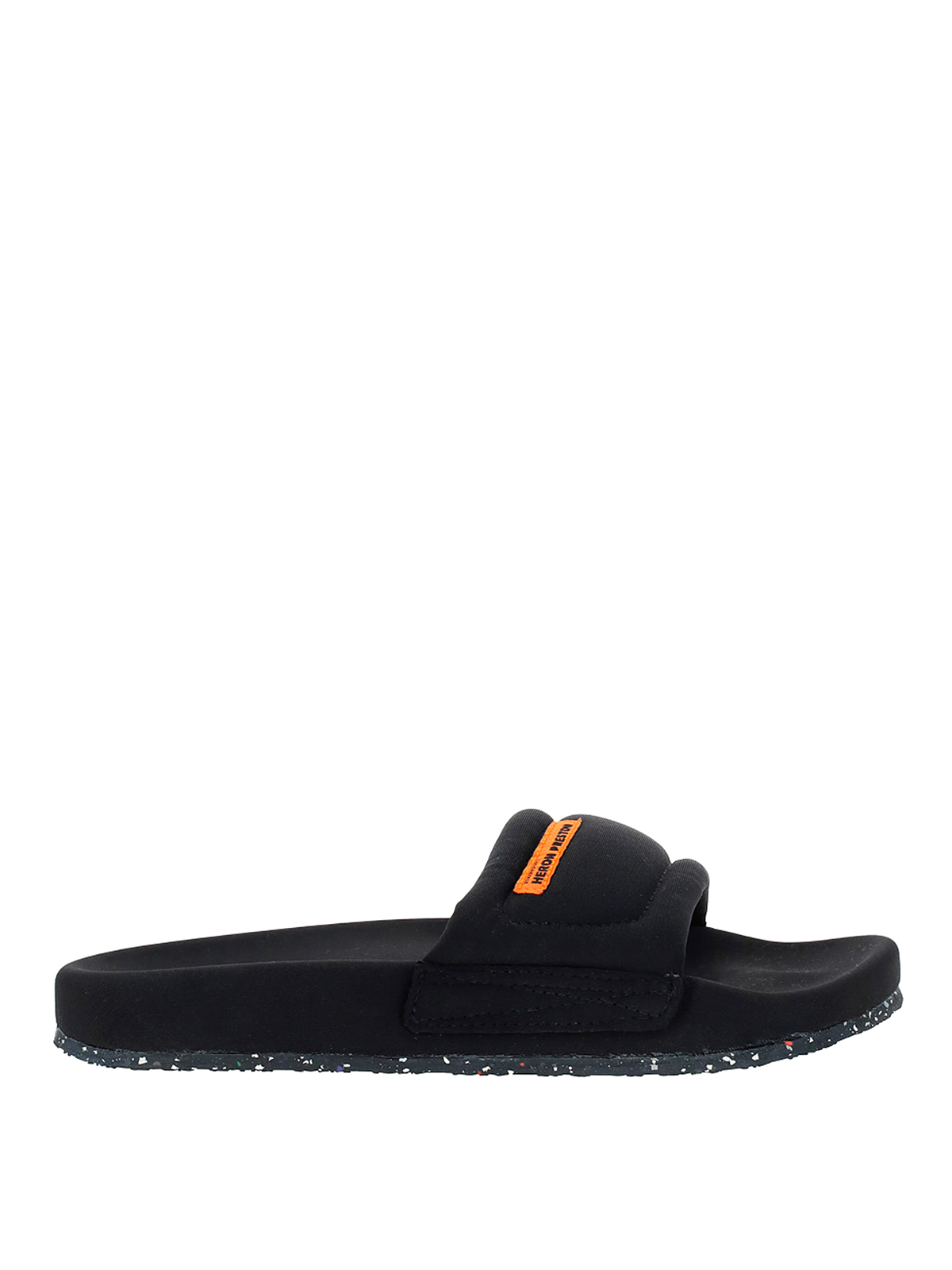 Slide sandals featuring open toe, front band with embroidery, iconic branded label and slip on design.