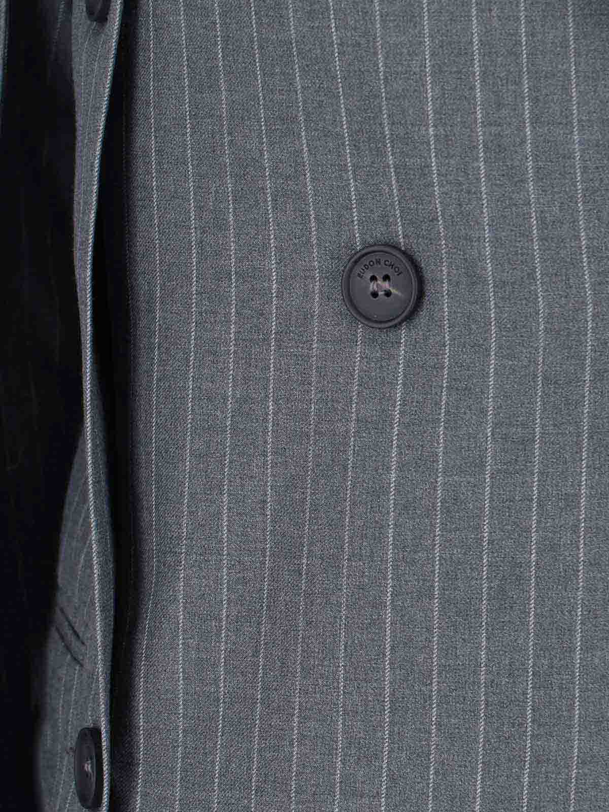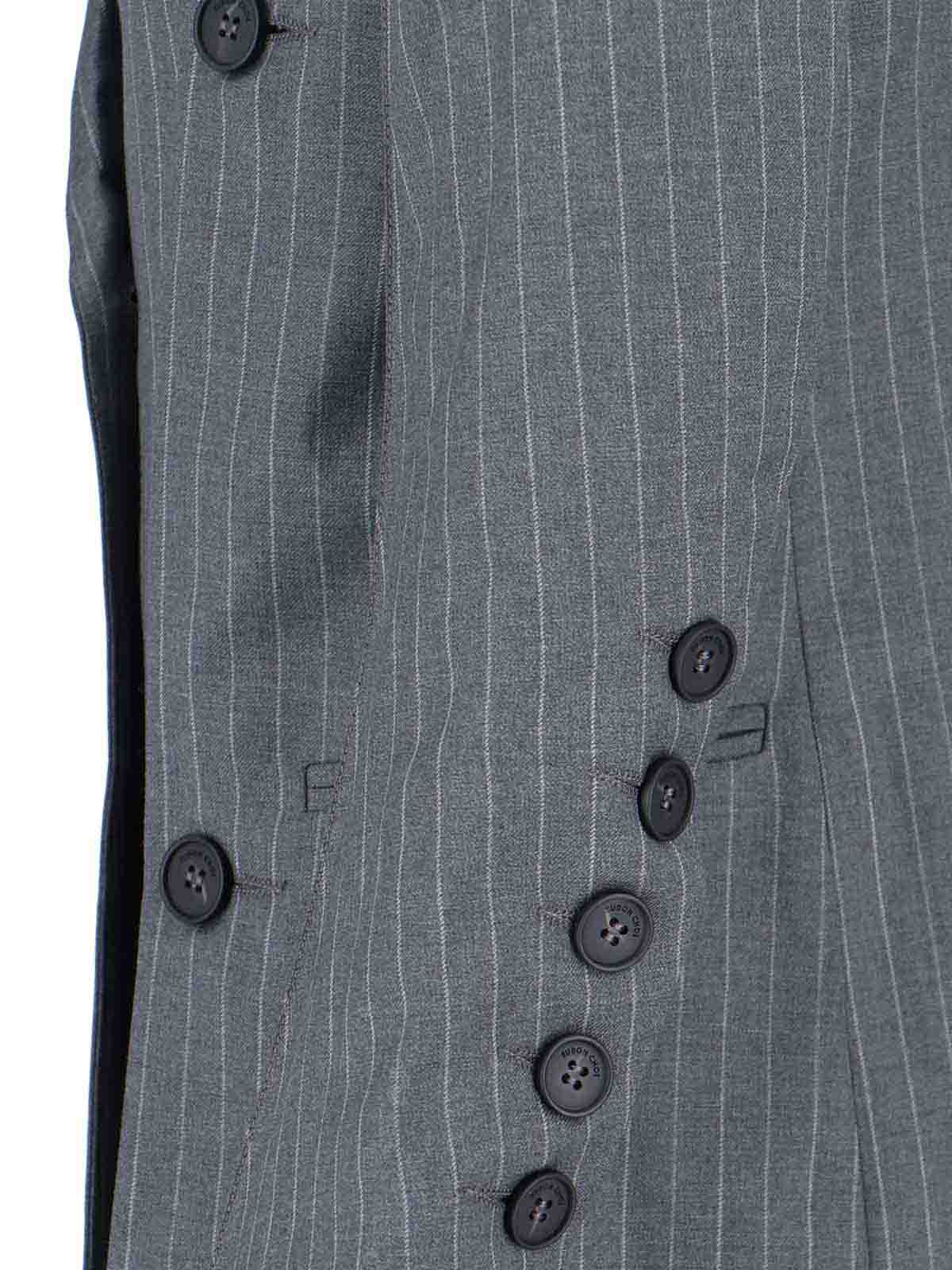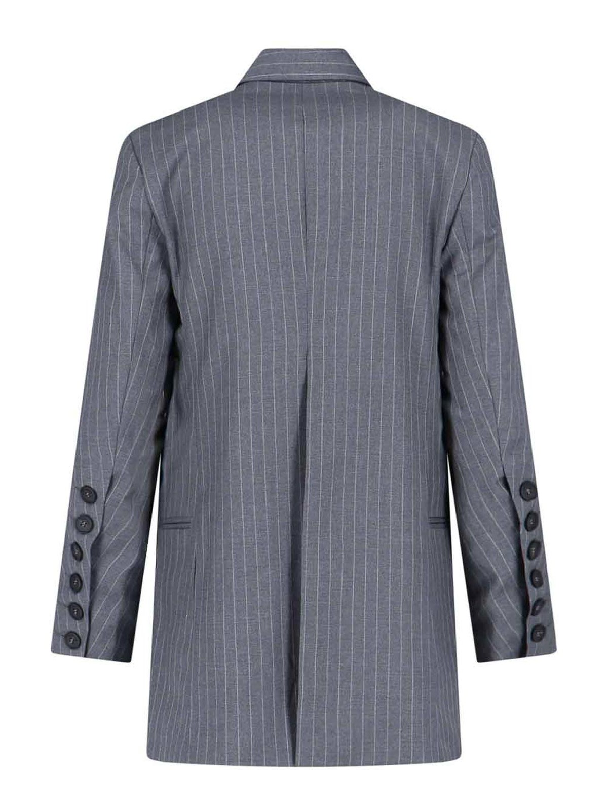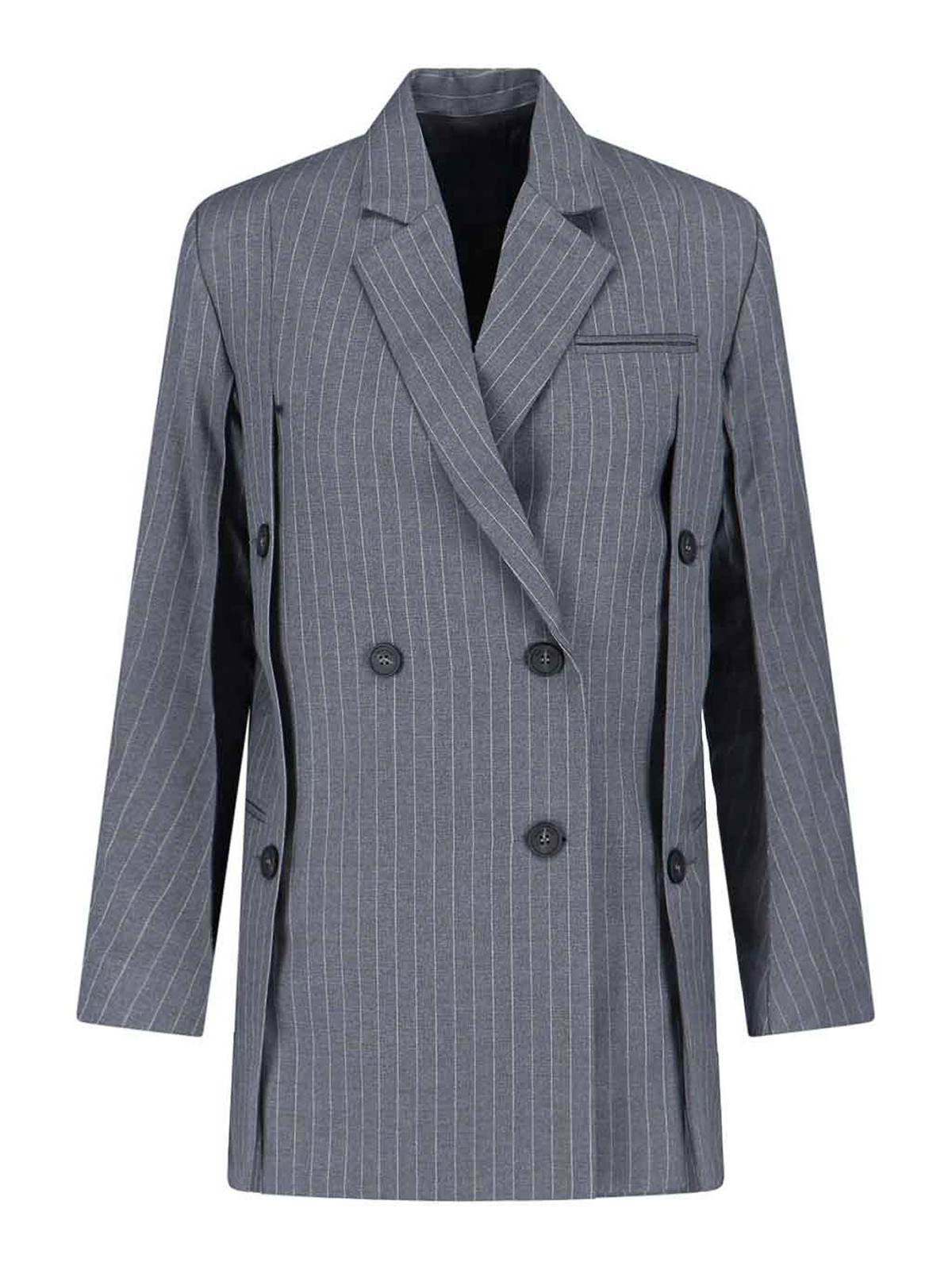 Eudon Choi Beatrice double-breasted blazer, in gray virgin wool, pinstripe pattern, peak lapels, button closure, side button detail, one flat front pocket, two side pockets, maxi button cuffs, rear vent detail, straight hem.