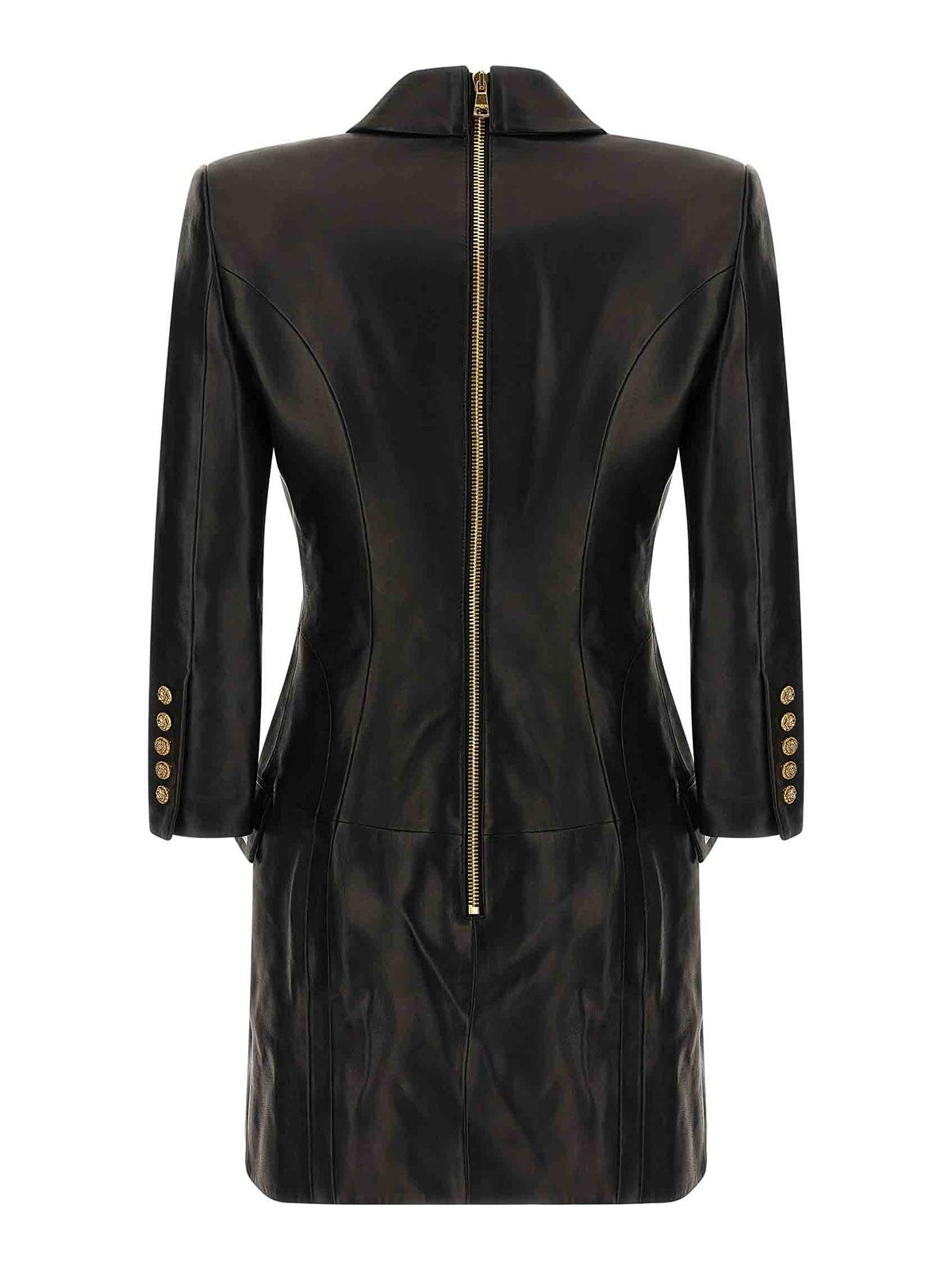 Leather mini dress with double-breasted blazer style, peak lapels, flap pockets, padded shoulder strap, long sleeves, and back zipper closure.