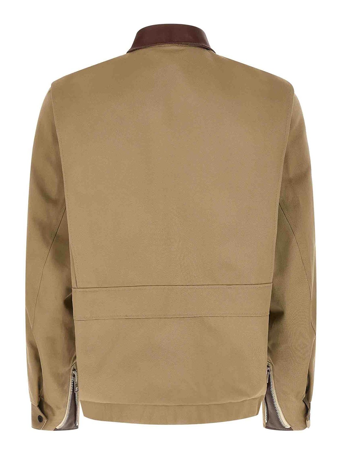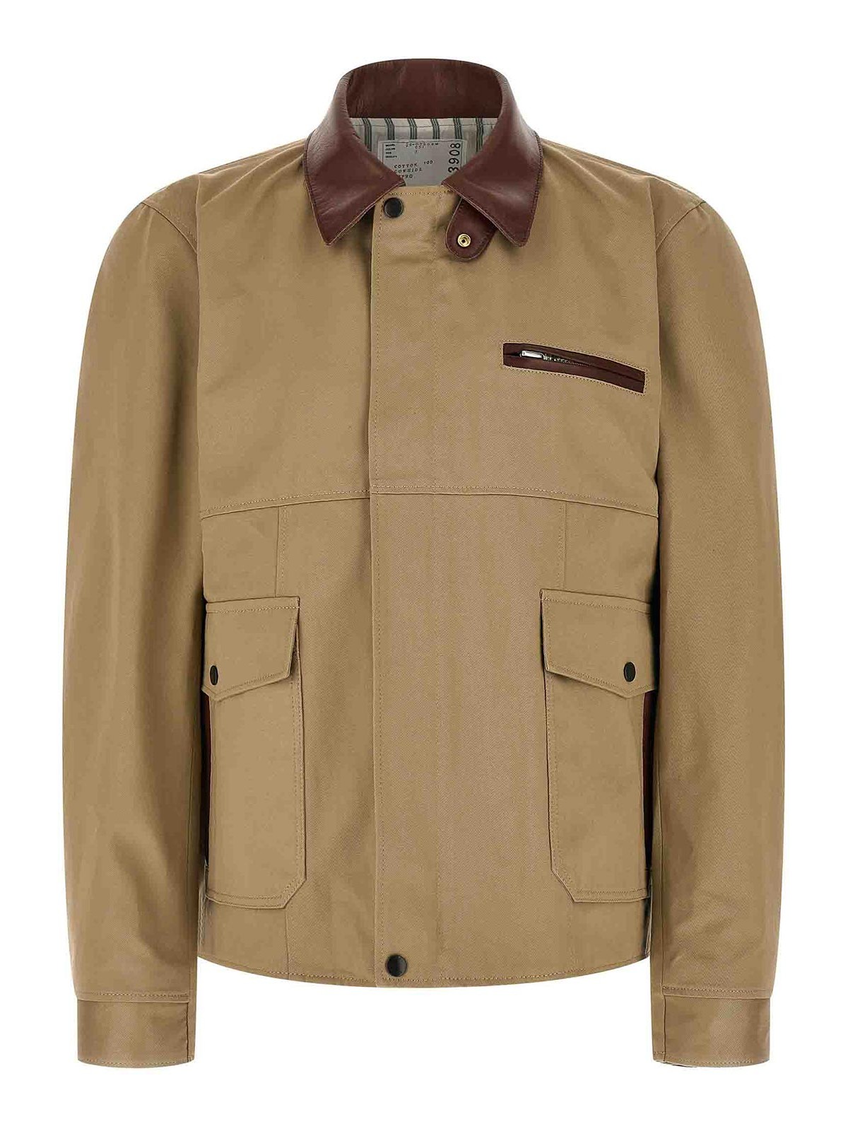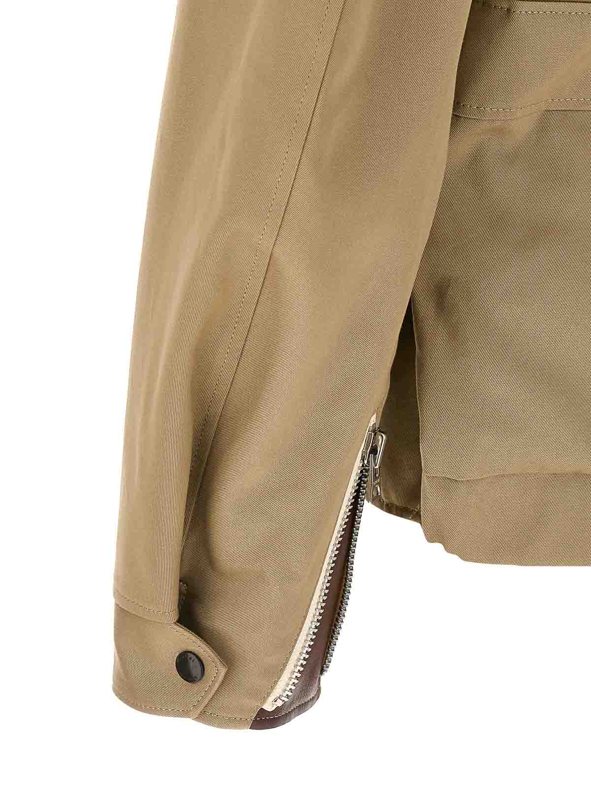 Chinos cotton jacket with nappa details, striped cupro lining, blouson style, shirt collar, front zip and snap button closure, pockets, long cuffed sleeves and zip on the cuffs, back elastic on the hem.