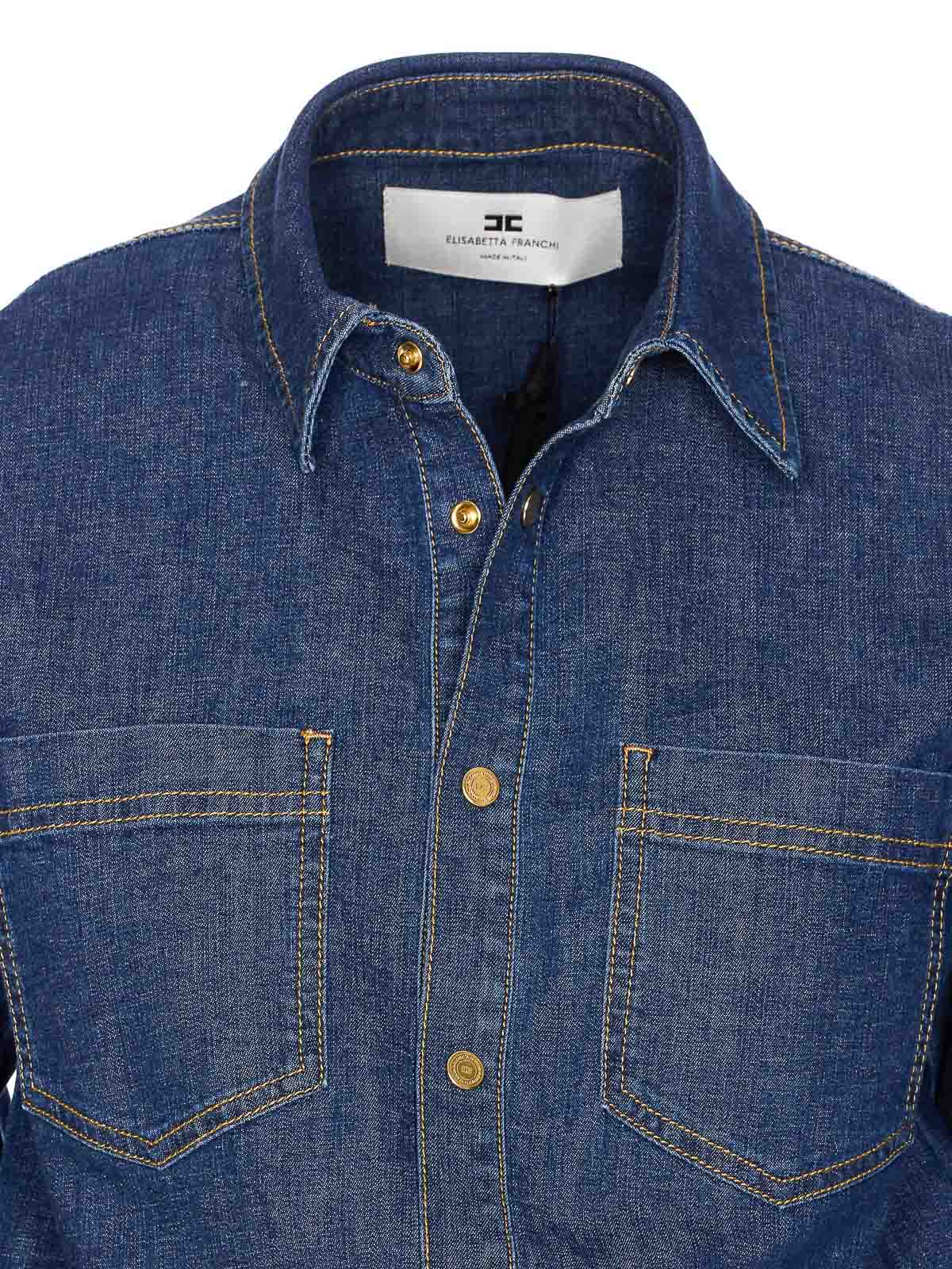 Elisabetta franchi blue denim dress, zip and snap buttons closure, contrasting stitching, logo on wrist