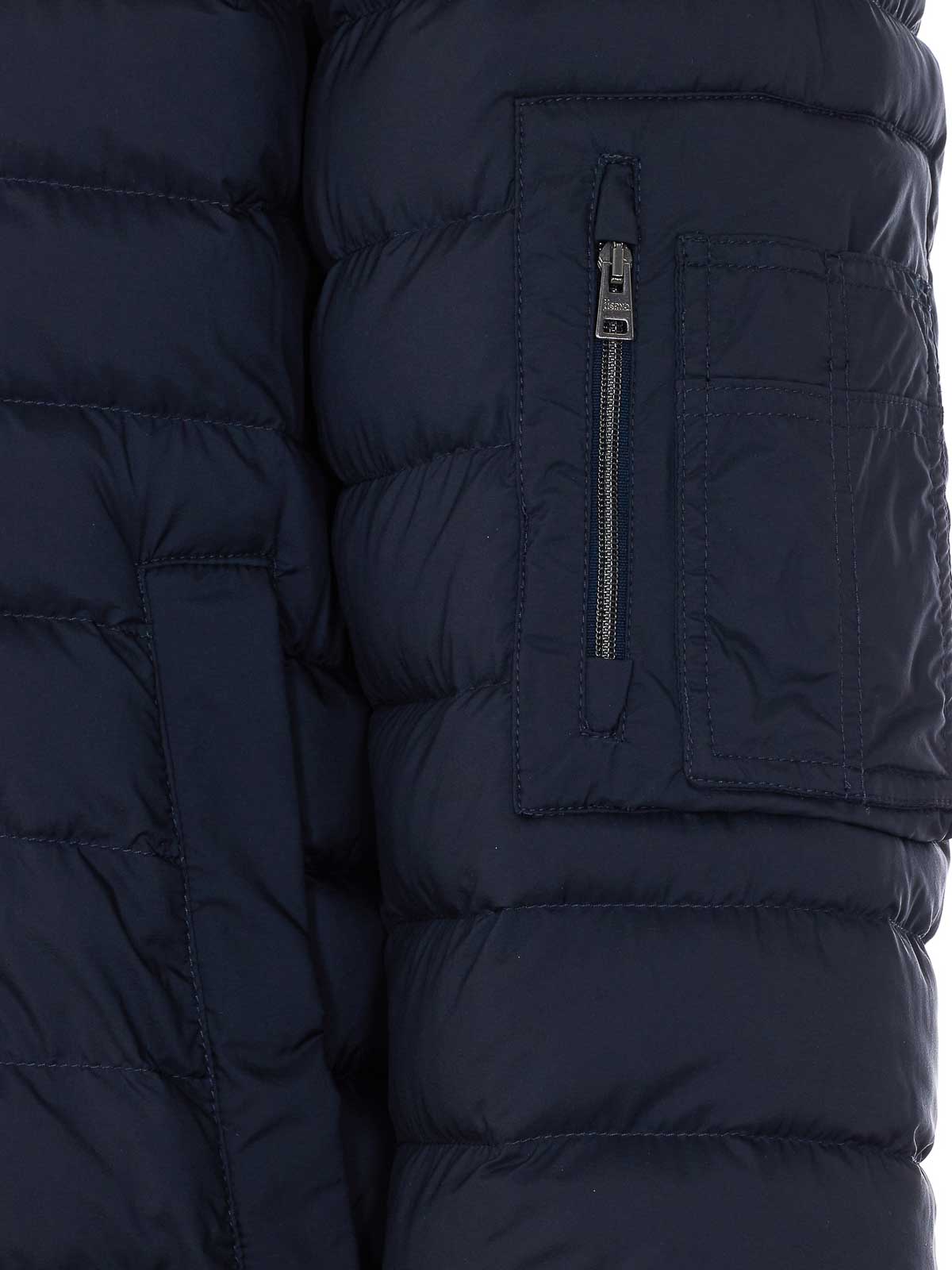 Herno blue down jacket with frontal zip closure, lateral pockets with button closure, long sleeves, pockets with button closure