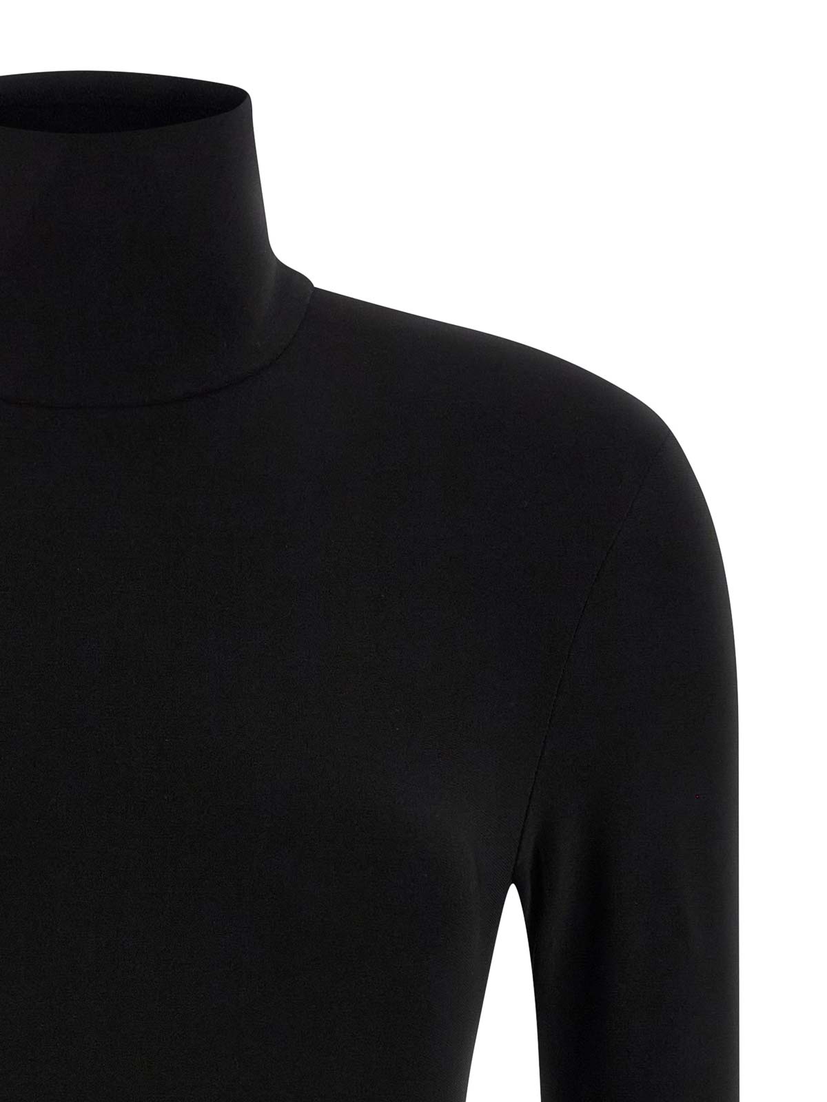 Poly lycra 4-way stretch bodysuit with high neck, wide oval cut-out on the back, long sleeves, snap buttons on the hem.