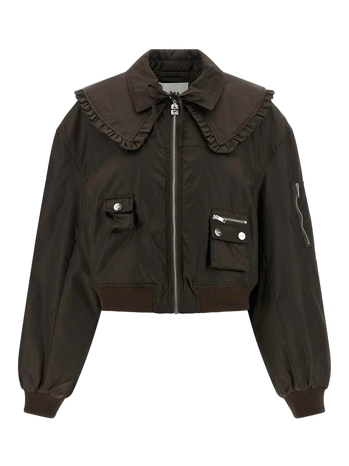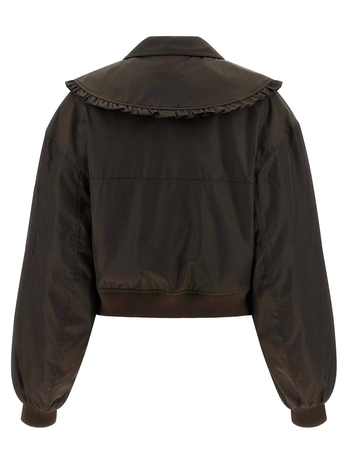 Duchesse 'duchesse nylon' nylon bomber jacket with tone-on-tone stretch ribbed knit details, slightly cropped lapel with removable ruffles, shirt collar, front zip closure, pockets, long wide sleeves with cuffs and dropped shoulder, band on the hem, monogram viscose blend lining.