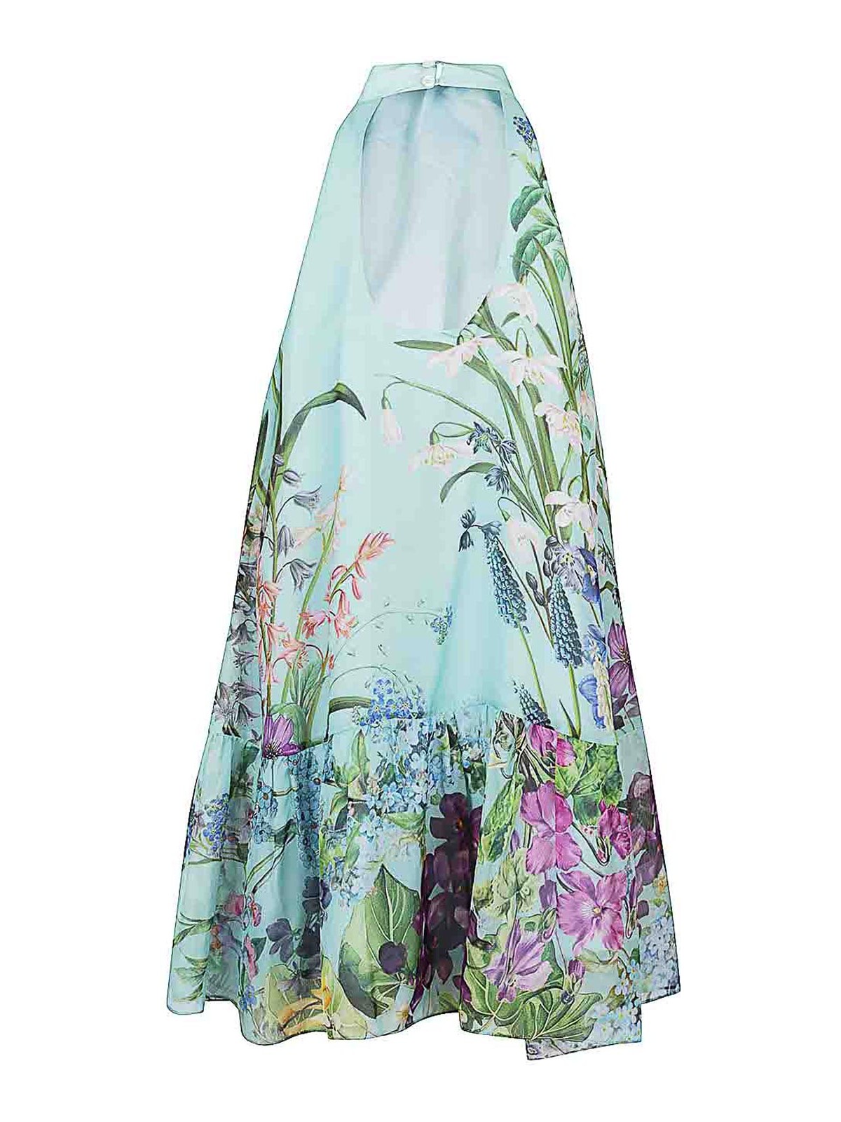 Light blue dress, high collar with button closure on the back, floral pattern, neckline on the back.