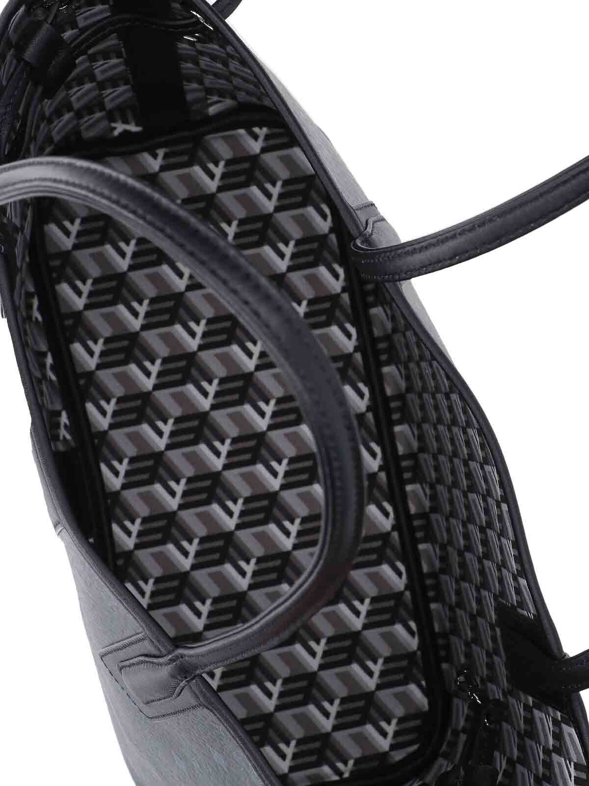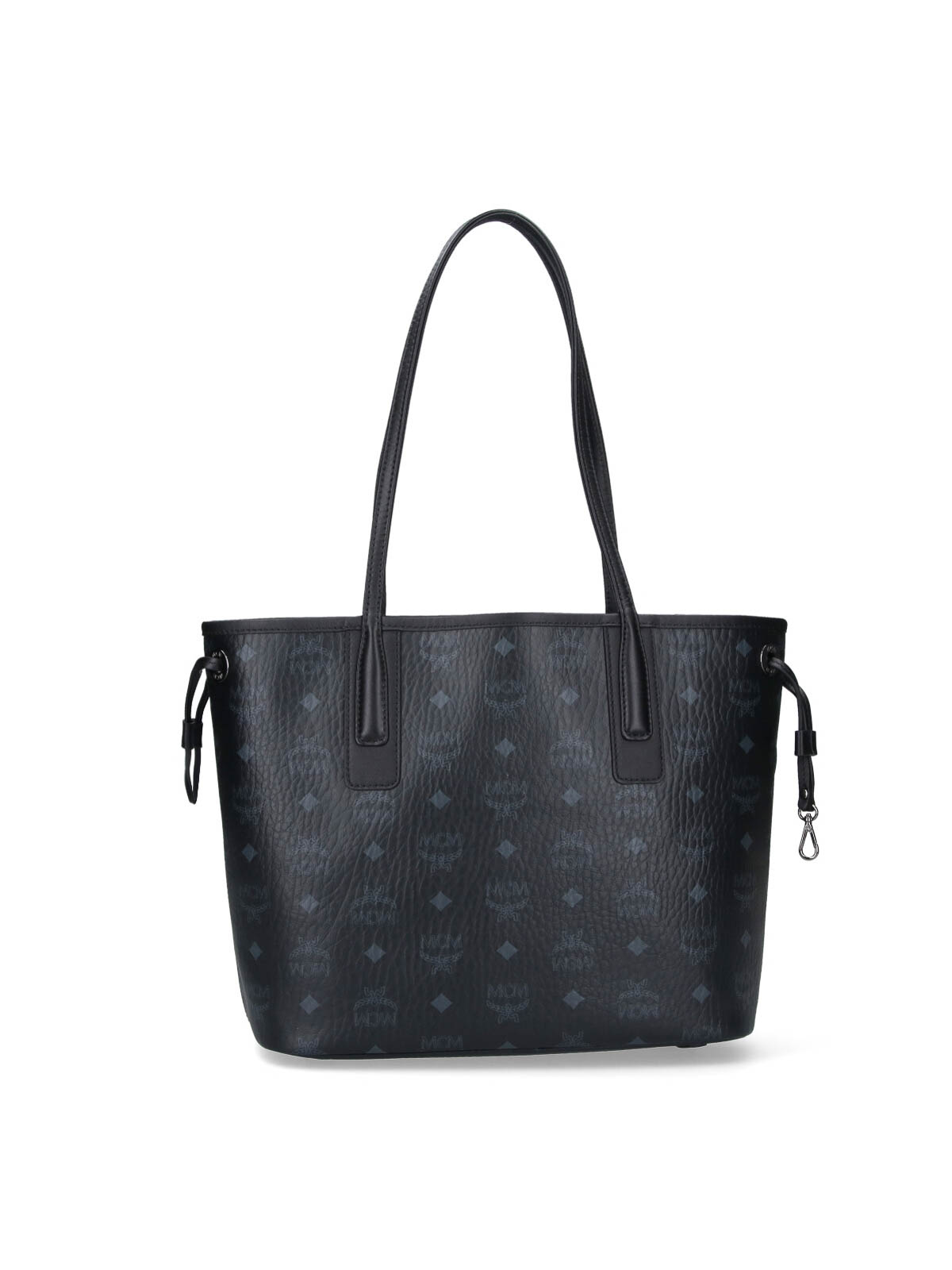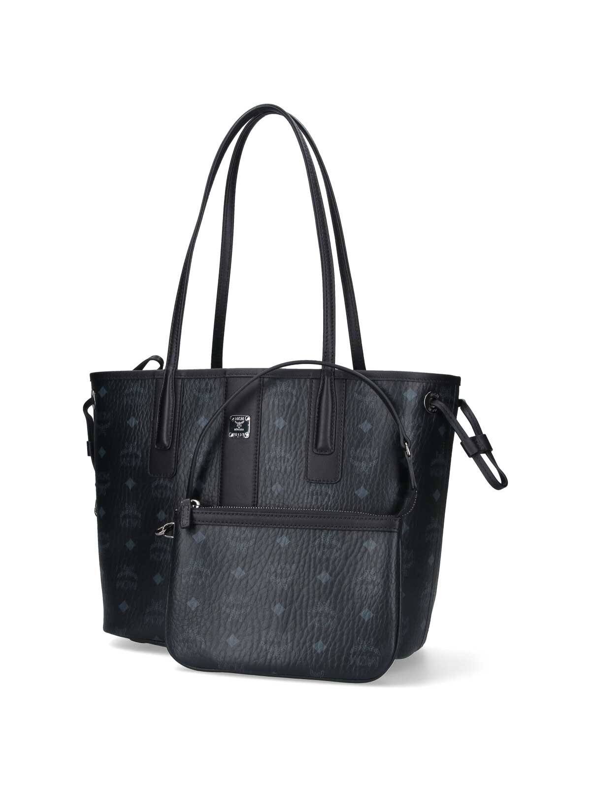 Liz mcm shopper bag, in black fabric, top handles, all-over mcm print motif, front silver metal logo detail, one internal zip pocket, one main internal compartment, leather finishes.