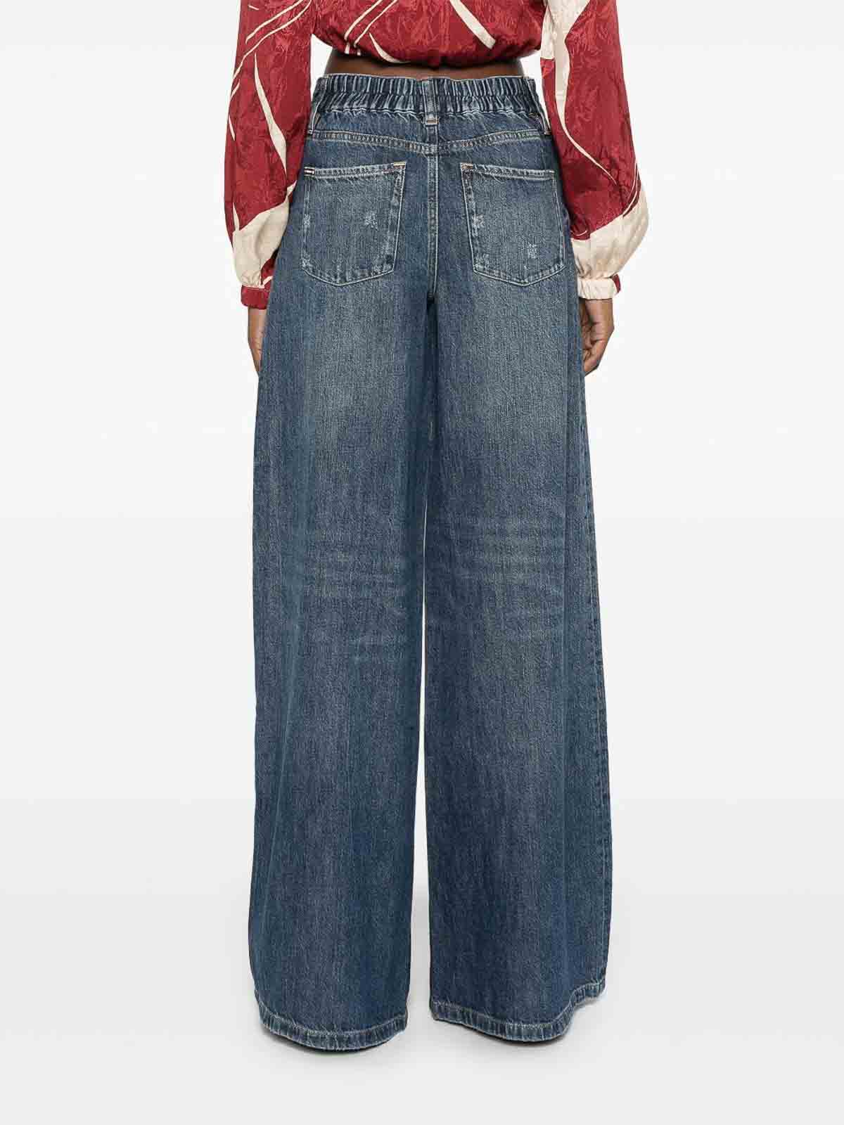 Indigo blue concealed fly and button fastening belt loops classic five pockets rear elasticated waistband