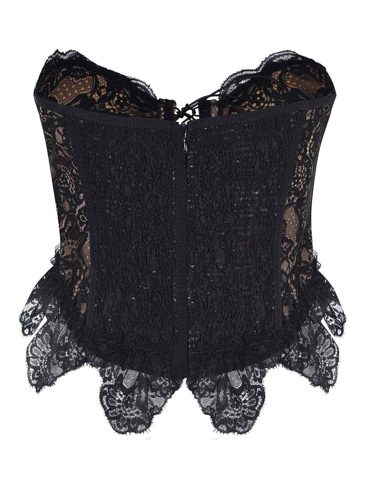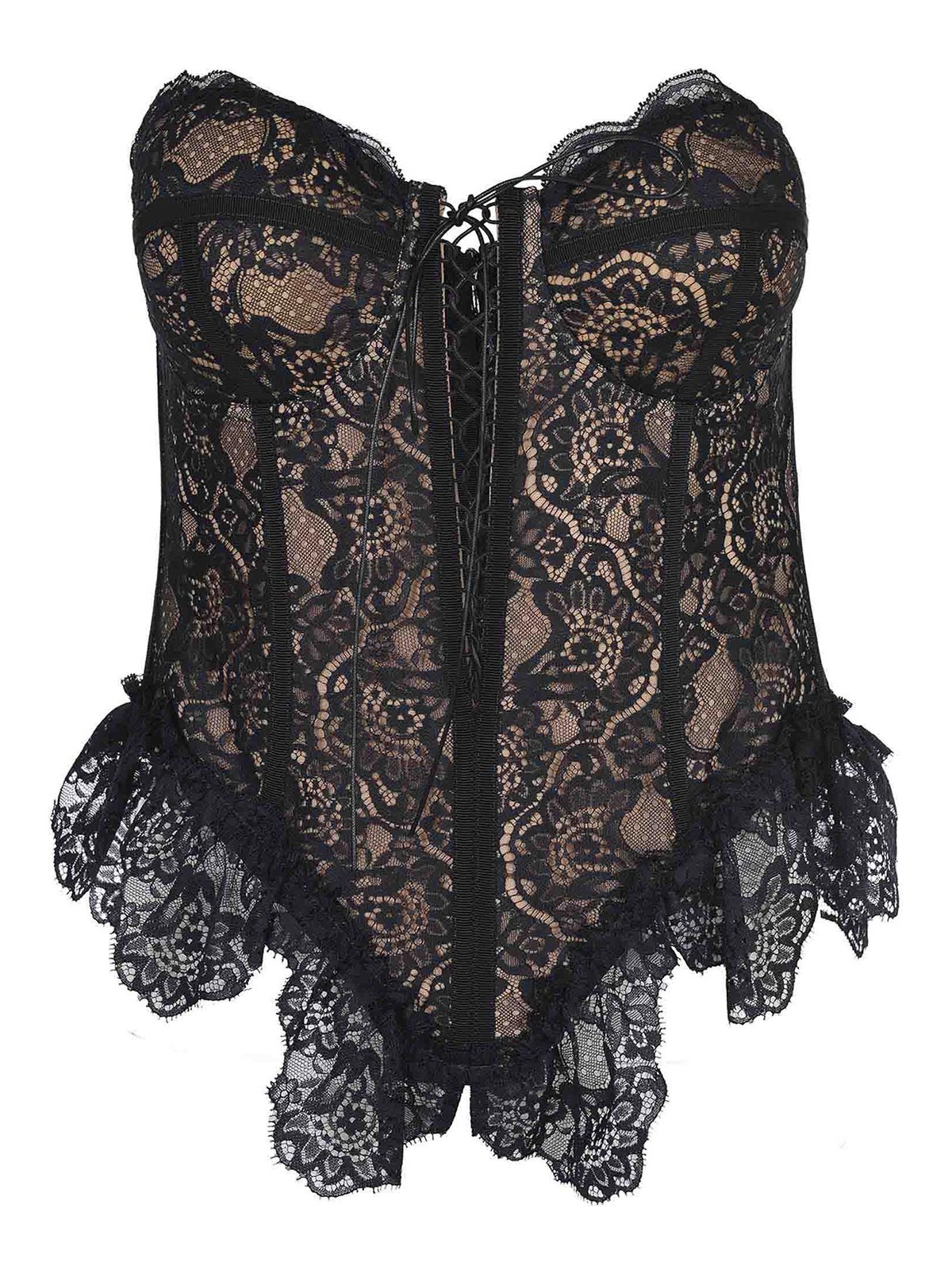 Giuseppe di morabito bustier made of black polyamide. heart-shaped neckline. sleeveless. entirely in lace. contrasting camel bottom. front closure with crisscross laces. closure with hooks on the back. internal structure. 100% polyamide made in italy.
