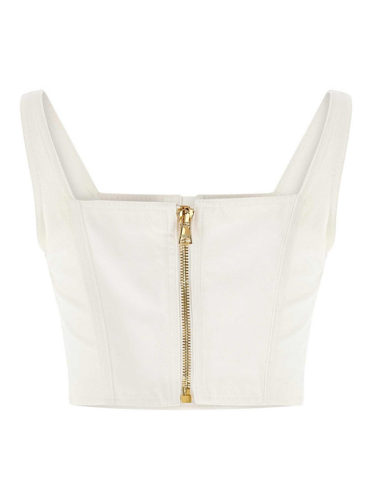 Cotton canvas top with round neckline, gold 'testa di leone' button detail at the front, gold back zip, sleeveless.