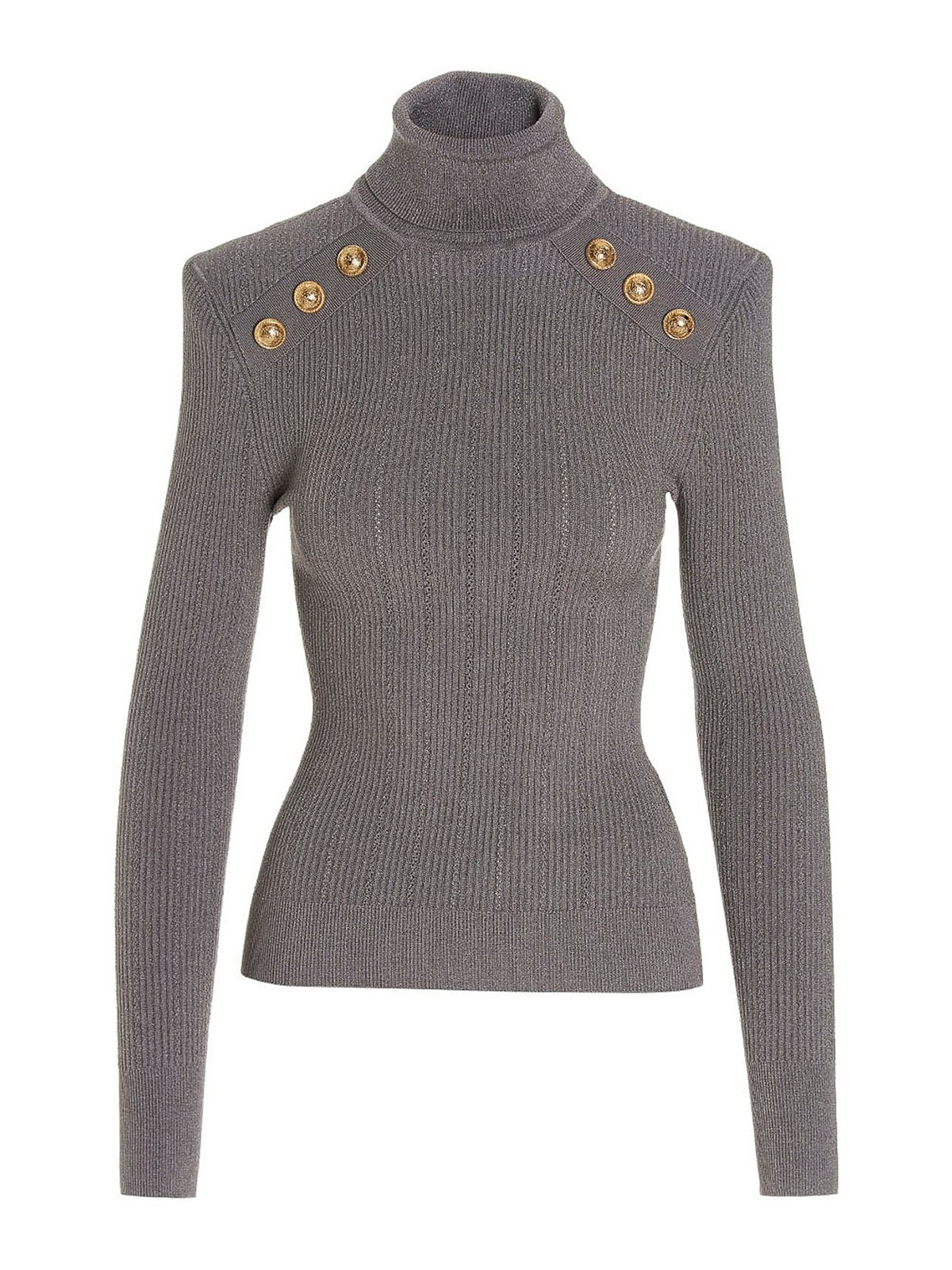 Button-trimmed turtleneck sweater with gold buttons, high neck, long sleeves and padded shoulders.