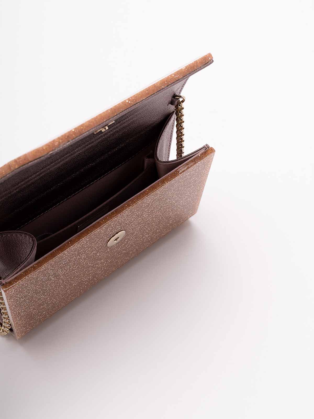 Compact bag with shiny finish, magnetic closure and removable shoulder strap.